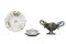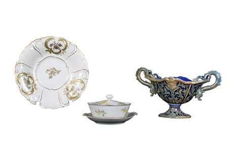 LOTTO COMPOSTO DA 1 ALZATA in maiolica policroma manifattura obbia Gualdo Tedino, 1 TAZZA DA PUERPERA in porcellana e 1 PIATTO DA PORTATA in porcellana decorata manifattura Valksteolt Elfeulun Matteo Gerardi Palermo XX secolo misure varie