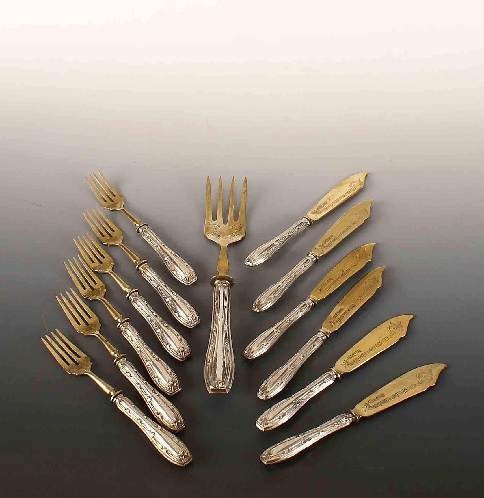 Servizio pesce composto da sei forchette, sei coltelli e un forchettone in metallo dorato con manici in argento, vecchia manifattura.