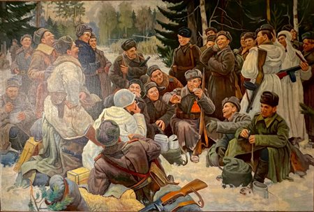 Yuri Mikhailovich (copia da) (1923 - ) Il riposo dopo la battaglia Seconda metà del XX secolo olio su tela cm 133 x 200