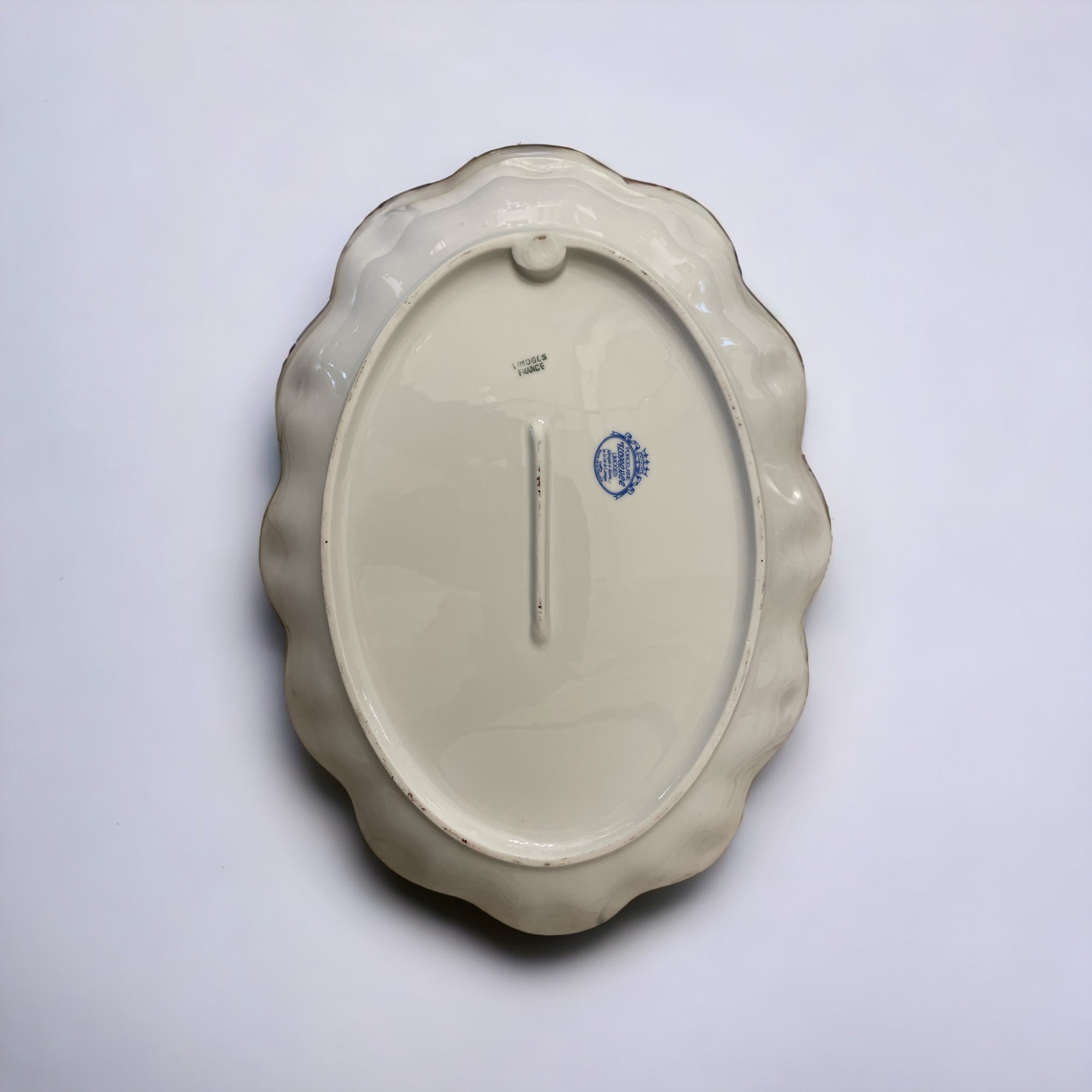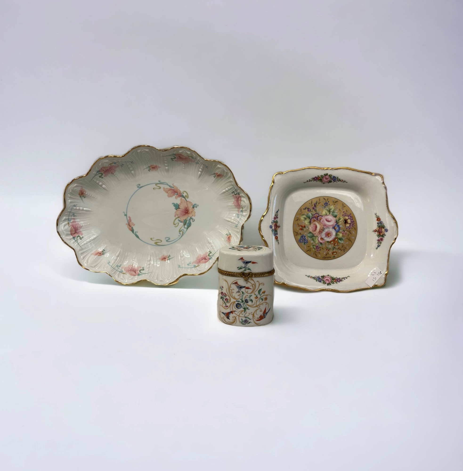 Tre elementi da servizio per la tavola in porcellana Limoges con decorazioni, stampigliature alla base.