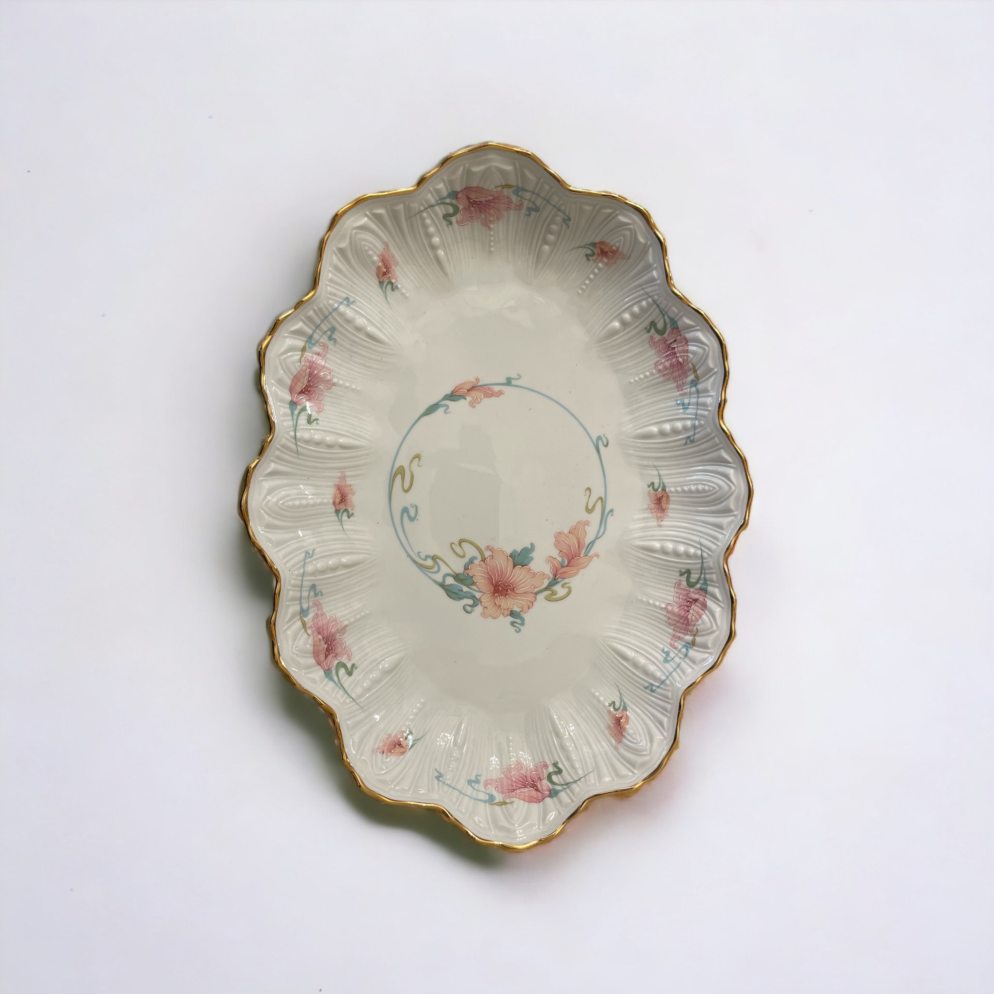 Piatto ovale con bordo mistilineo dorato: cm 3 x 35 x 27.