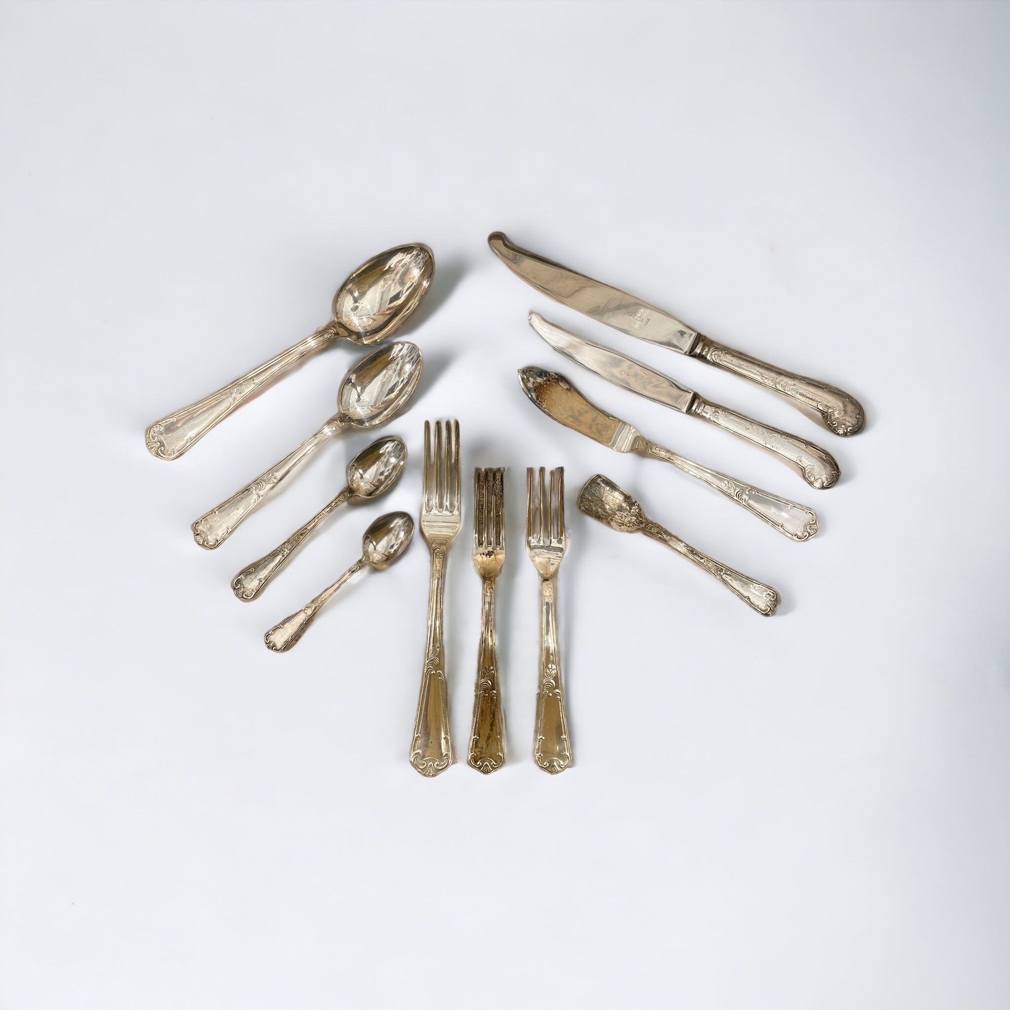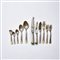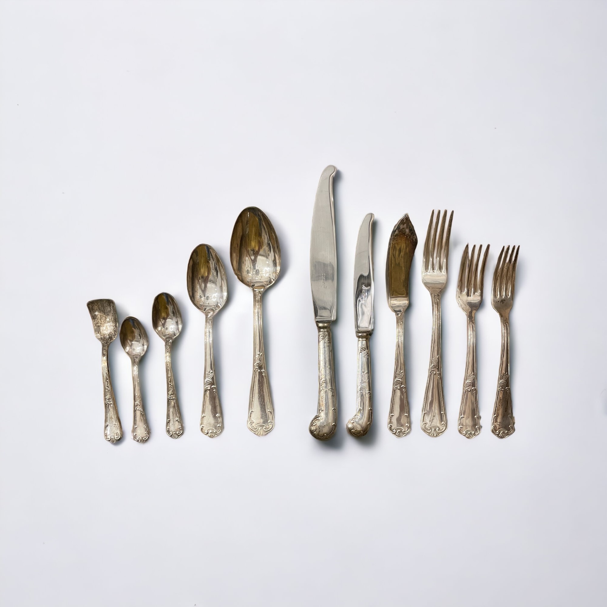 Composto da: 24 forchette, 12 coltelli, 11 forchette da frutta, 12 coltelli da frutta, 12 cucchiai, 12 cucchiai da frutta, 11 cucchiaini, 9 cucchiaini da caffè, 11 cucchiaini da gelato, 12 forchette da pesce, 12 coltelli da pesce.