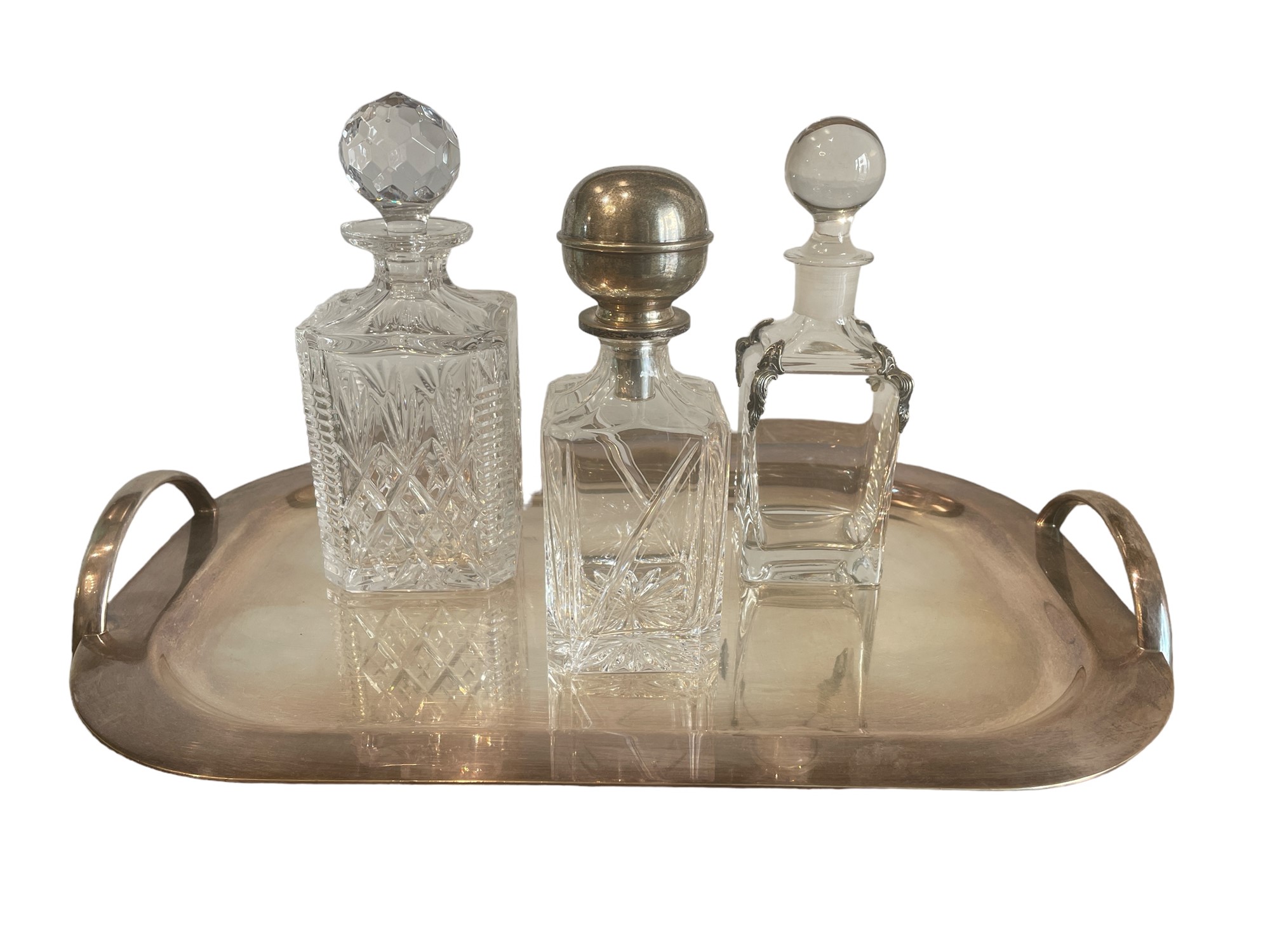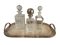 composto da un vassoio e tre bottiglie da liquore in vetro