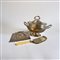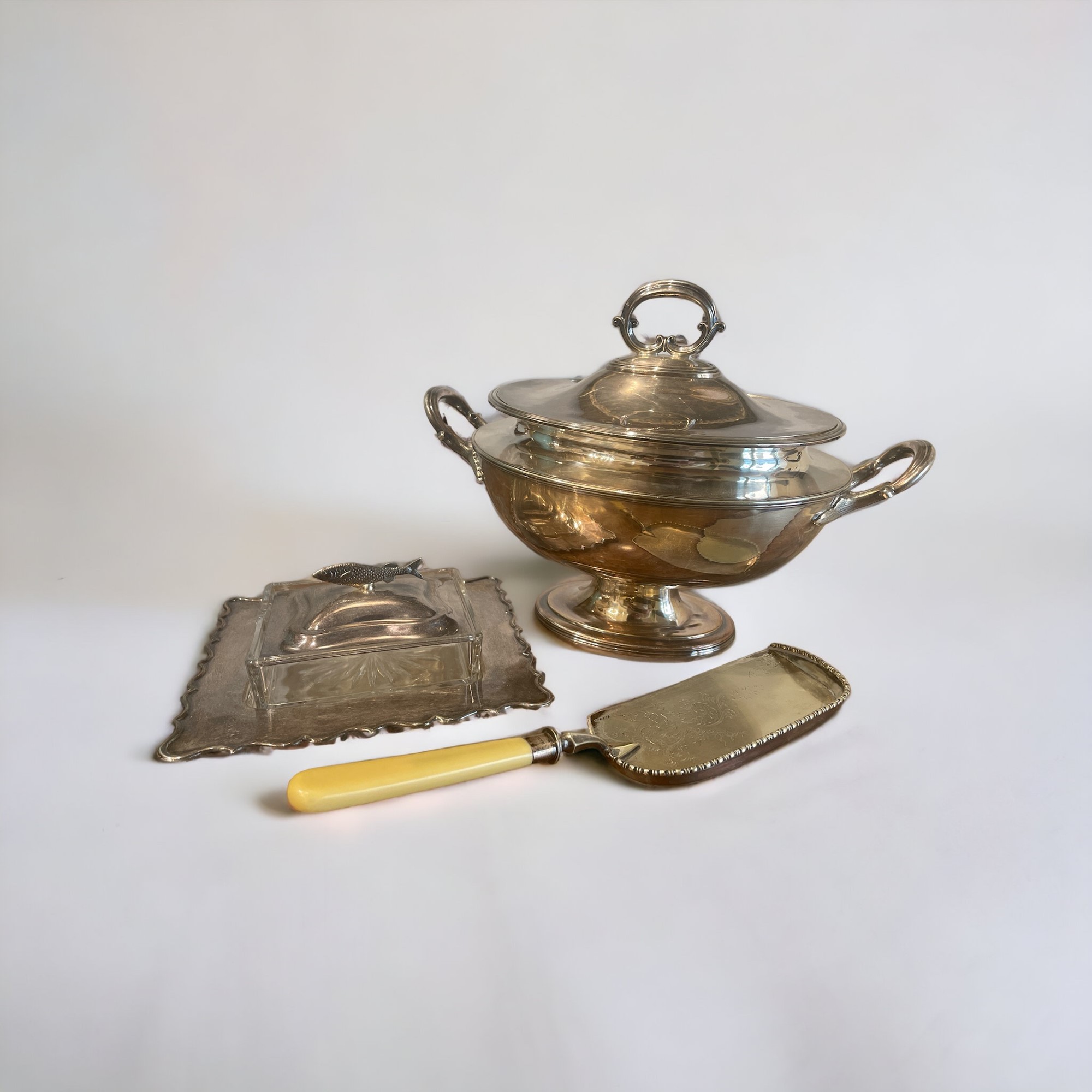 tra cui una Zuppiera, un raccoglibriciole e una burriera, in metallo argentato.