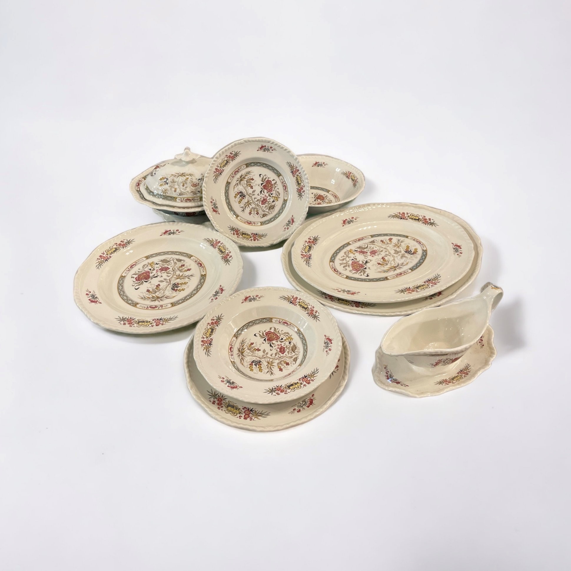 In porcellana decorata a motivi floreali. Composto da: 23 piatti piani, 12 piatti fondi, 12 piatti da dessert, 1 piatto da portata rotondo, 2 piatti da portata ovali, 1 insalatiera, 1 salsiera, 1 zuppiera, 2 piatti ovali piccoli.