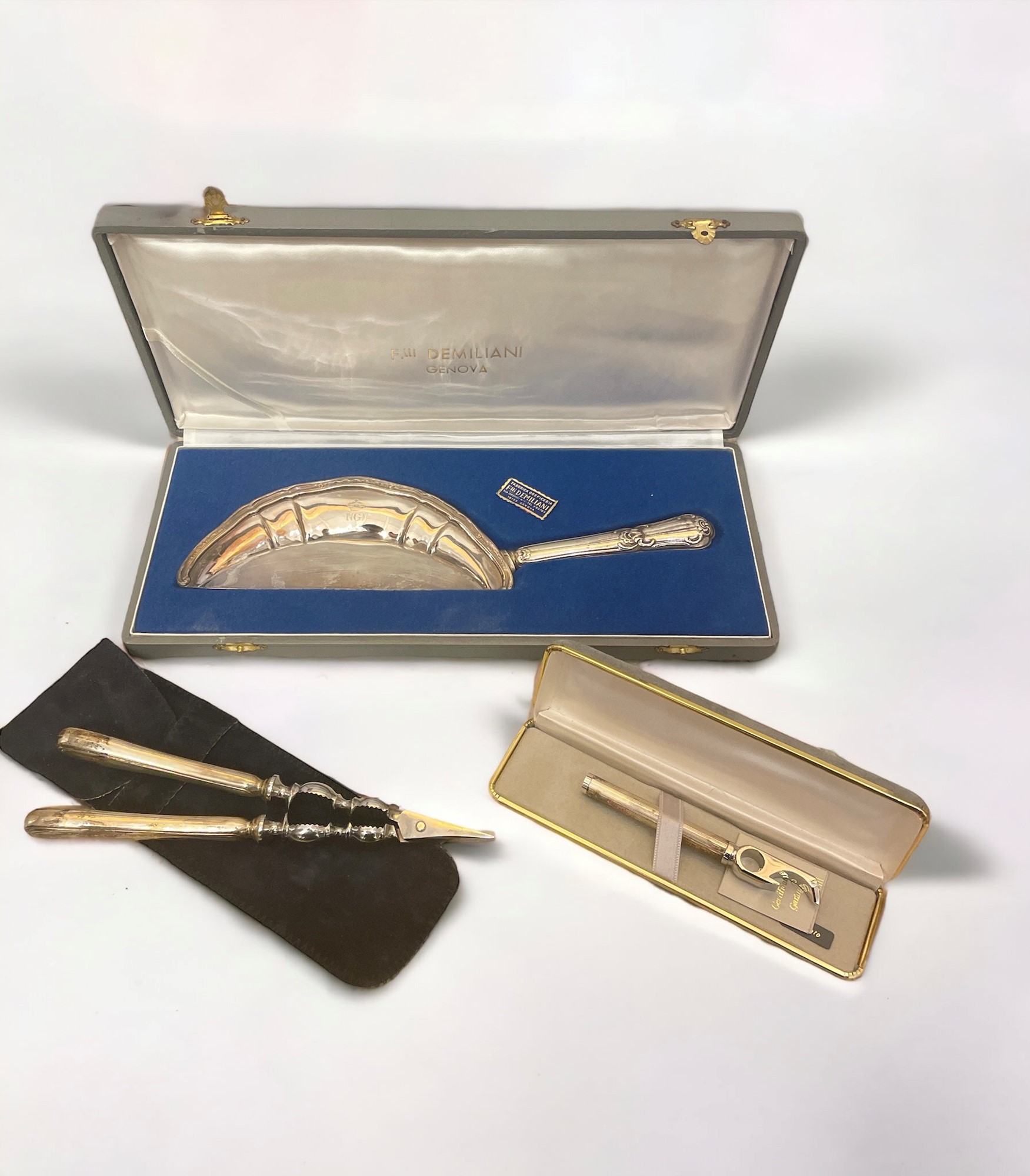 Un raccogli briciole marchiato Christofle con scatola originale, un cavatappi/stappatappi in acciaio e argento 925 CORKSCREW con dedica gennaio 1991 e scatola originale e pinze schiaccianoci con forbici per uva in argento 800 e inoxid, con custodia.