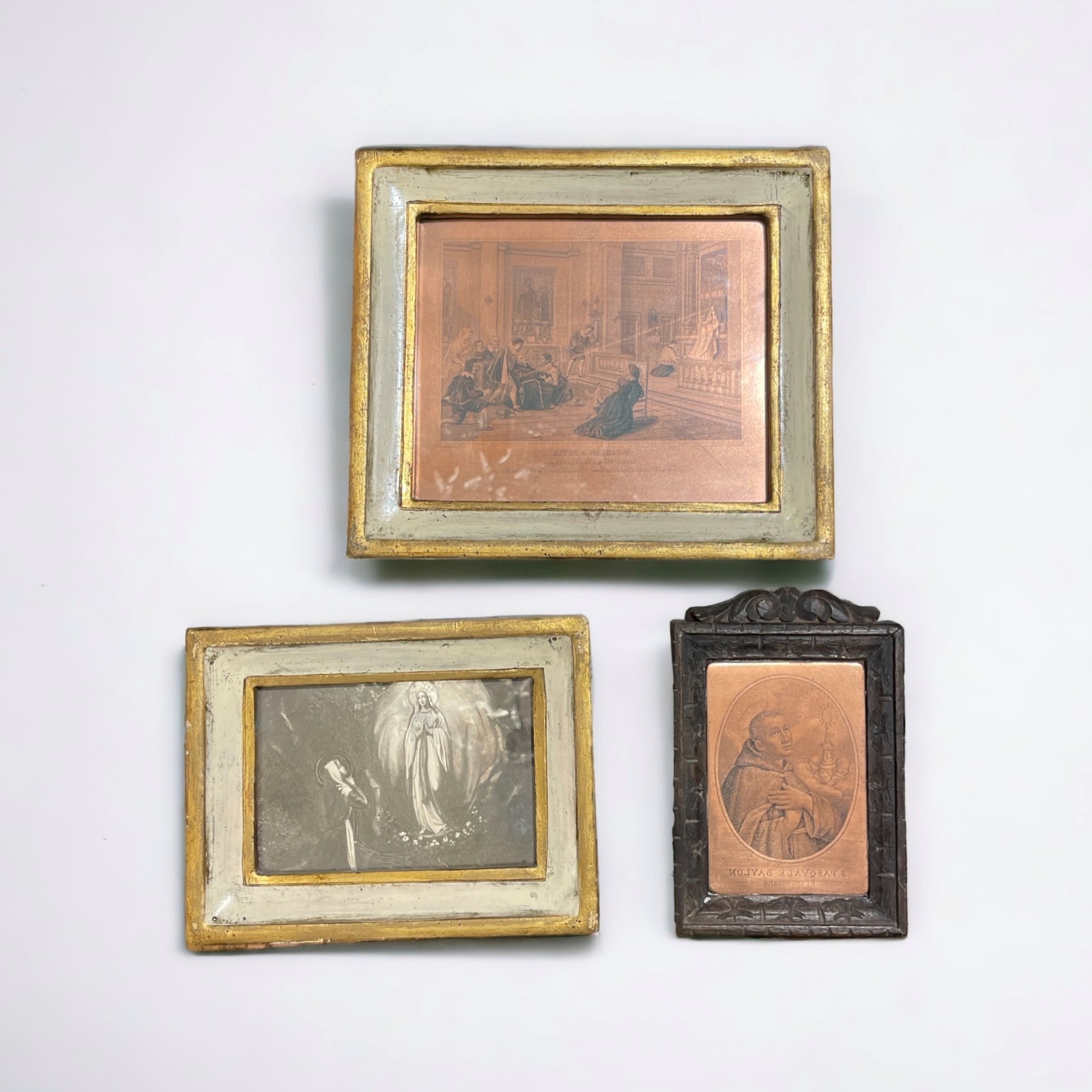 Matrici da stampa in rame in parte acciaiate, raffiguranti scene religiose. In cornice.