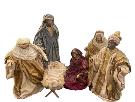 in cartapesta e terracotta. Composto dalla sacra famiglia (Gesù, Giuseppe e Maria) e tre re magi. Rotture e mancanze. Abbigliamento d'epoca