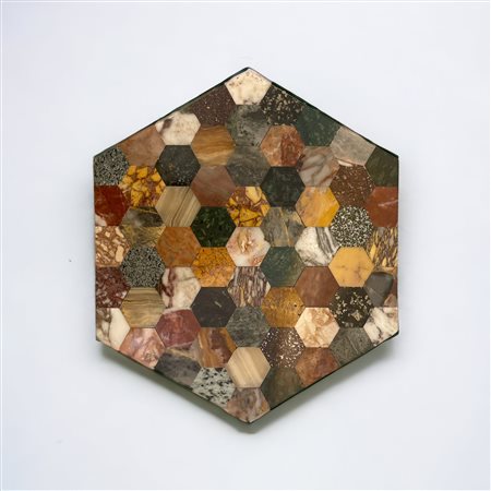 In marmi antichi e pietre dure, tra cui porfido, serpentino, rosso antico, giallo antico, granito del foro. Lastronato su travertino.