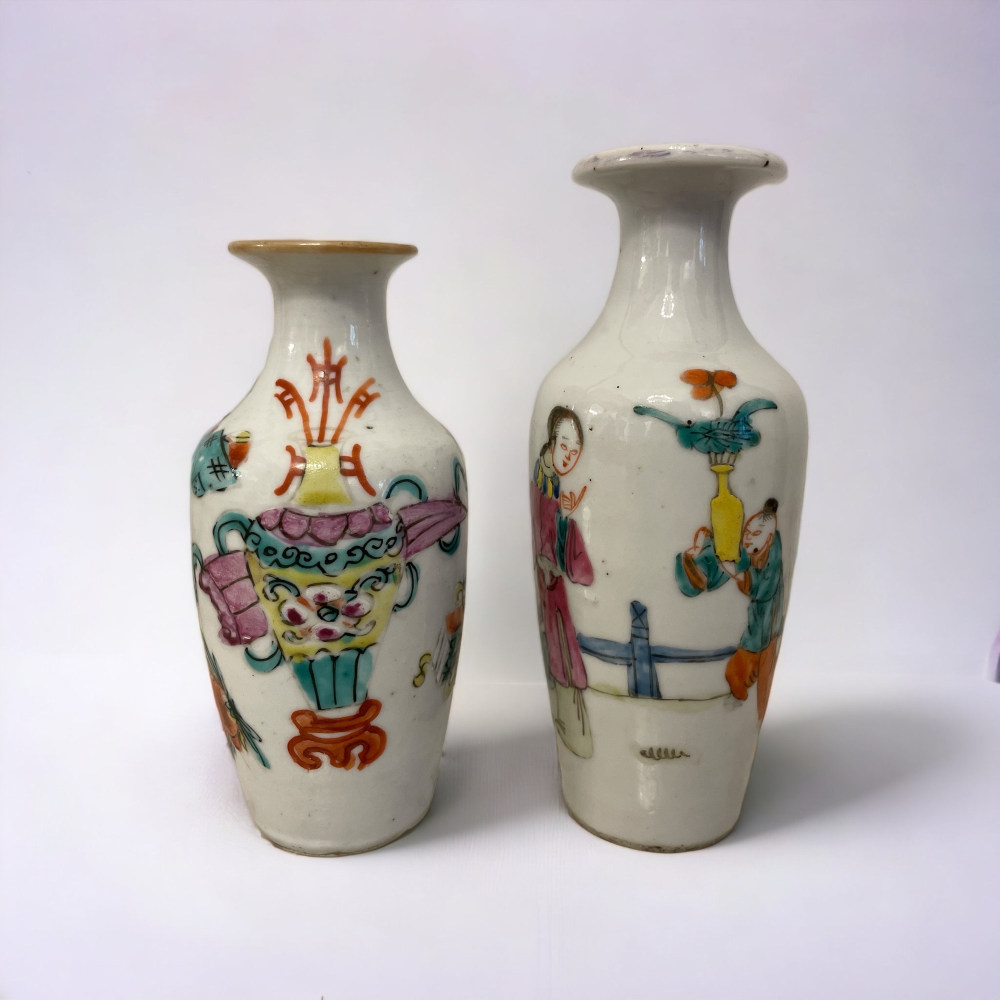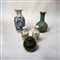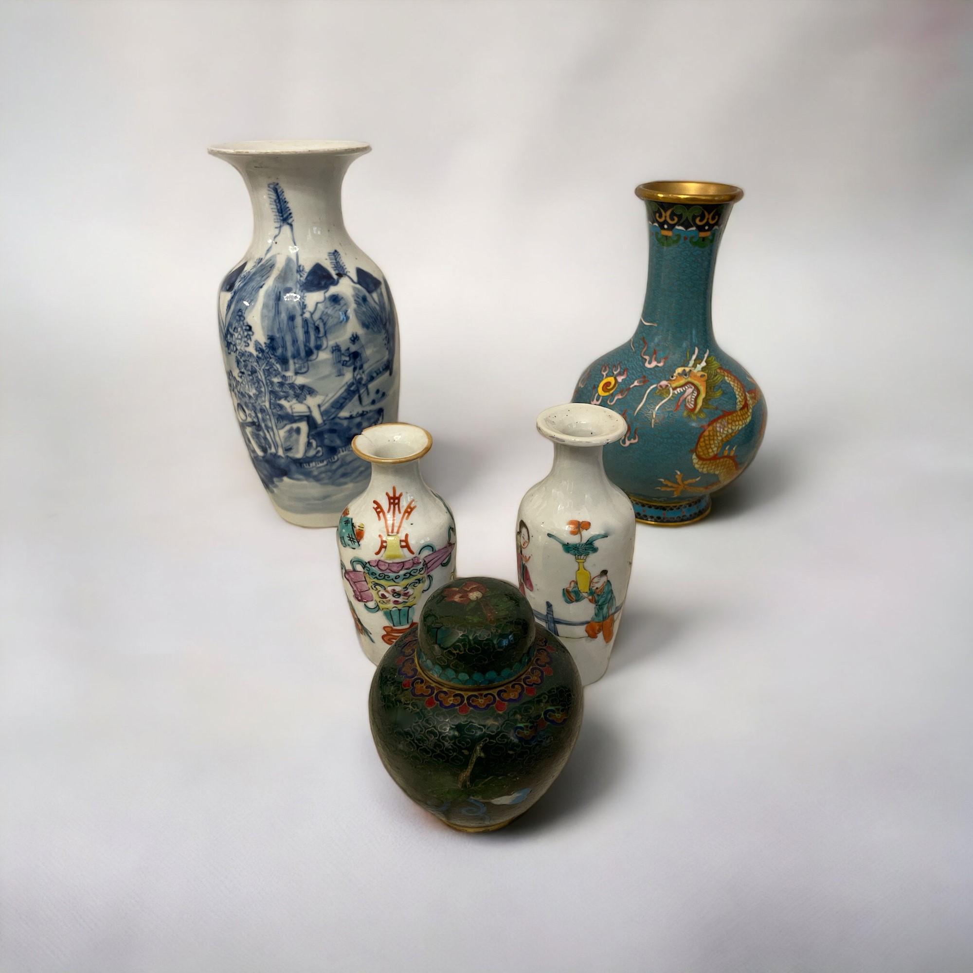 Di cui tre in porcellana policroma (di cui il maggiore misura: cm 22 x 7) e due in bronzo cloisonné. Piccoli difetti.