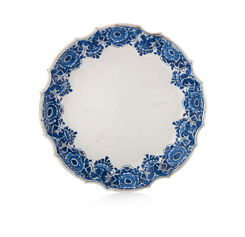 PIATTO IN MAIOLICA, LODI, XVIII SECOLO, a profilo mistilineo, decoro blu alla Rouen; lieve fessura.