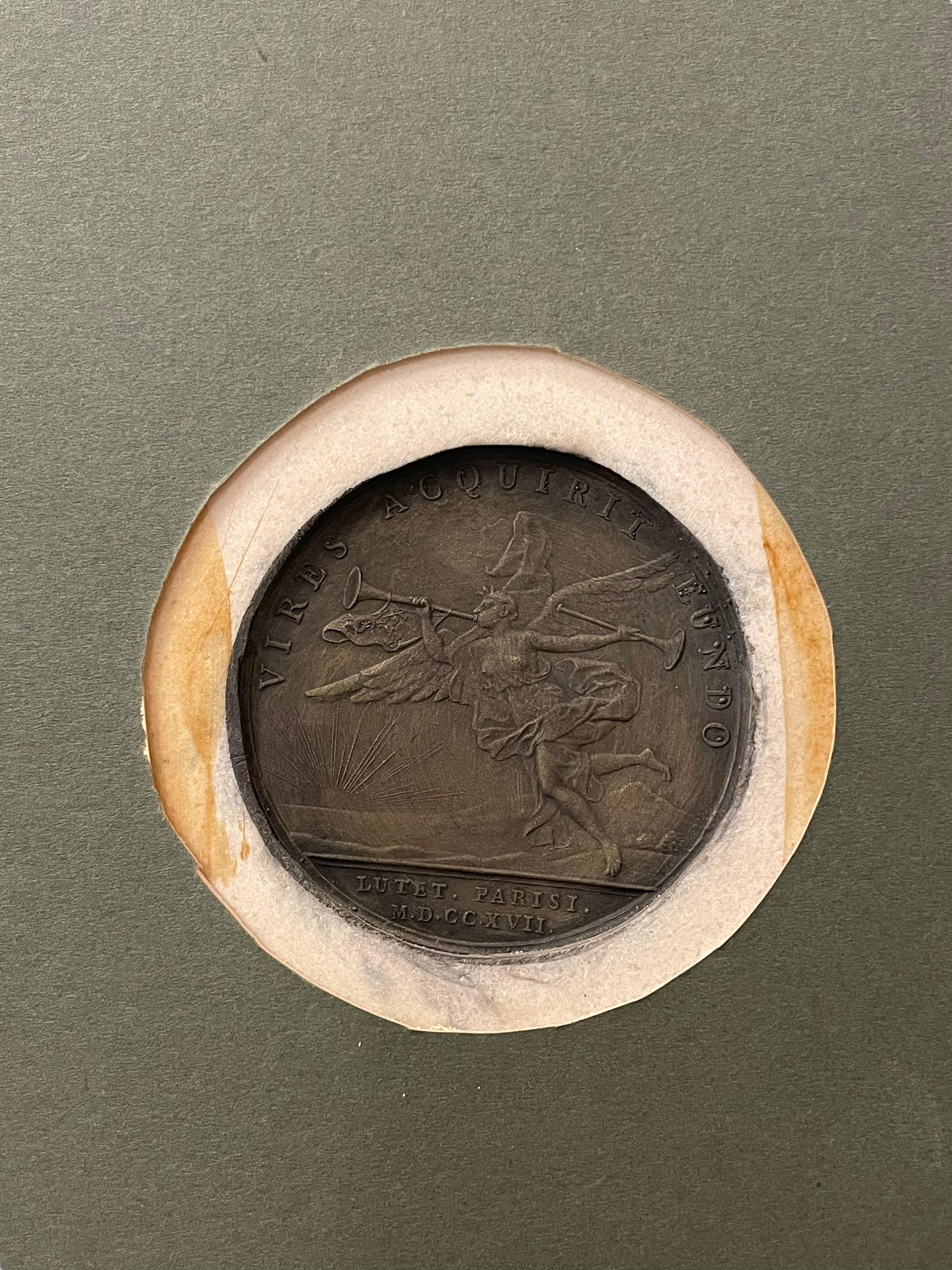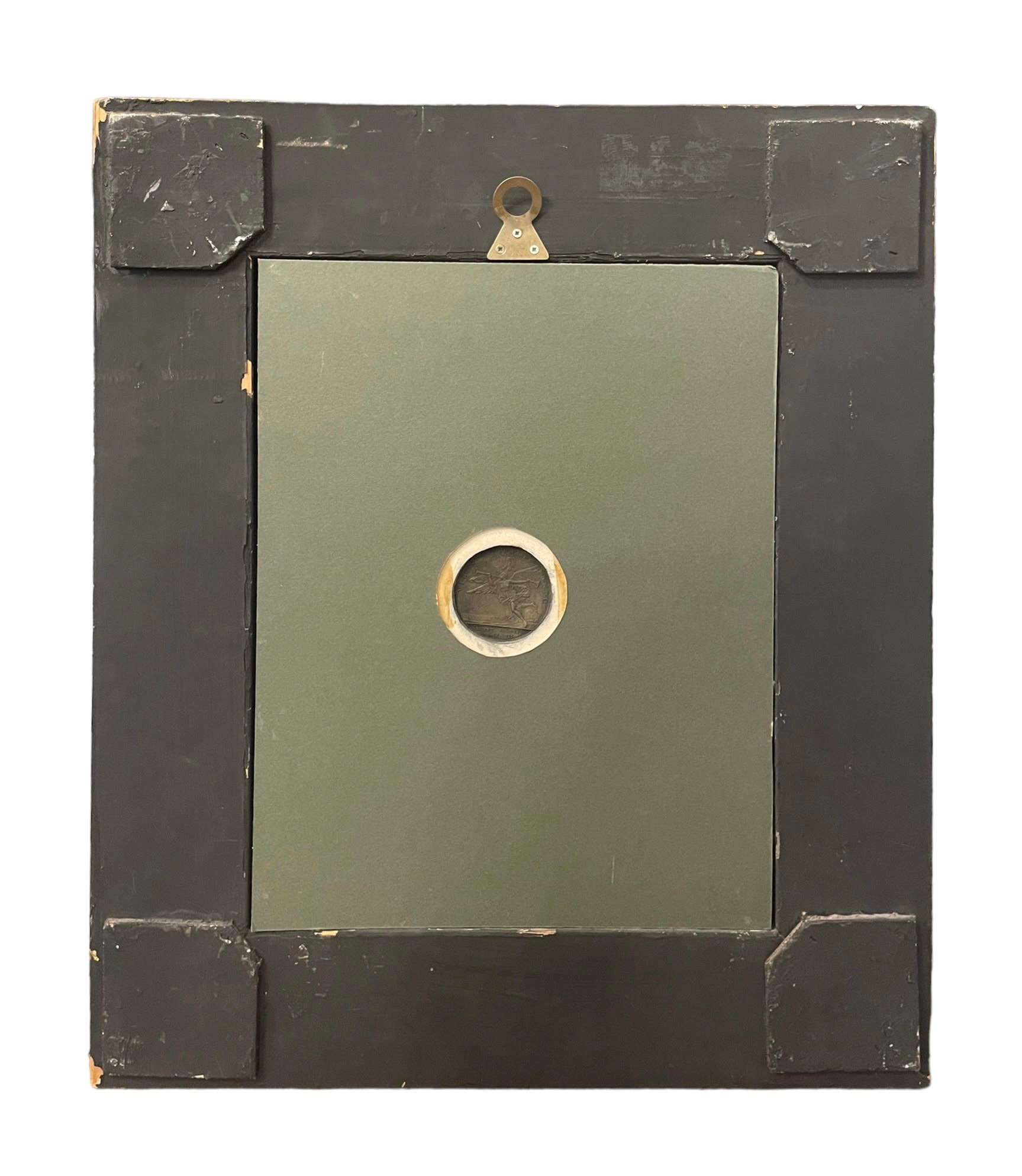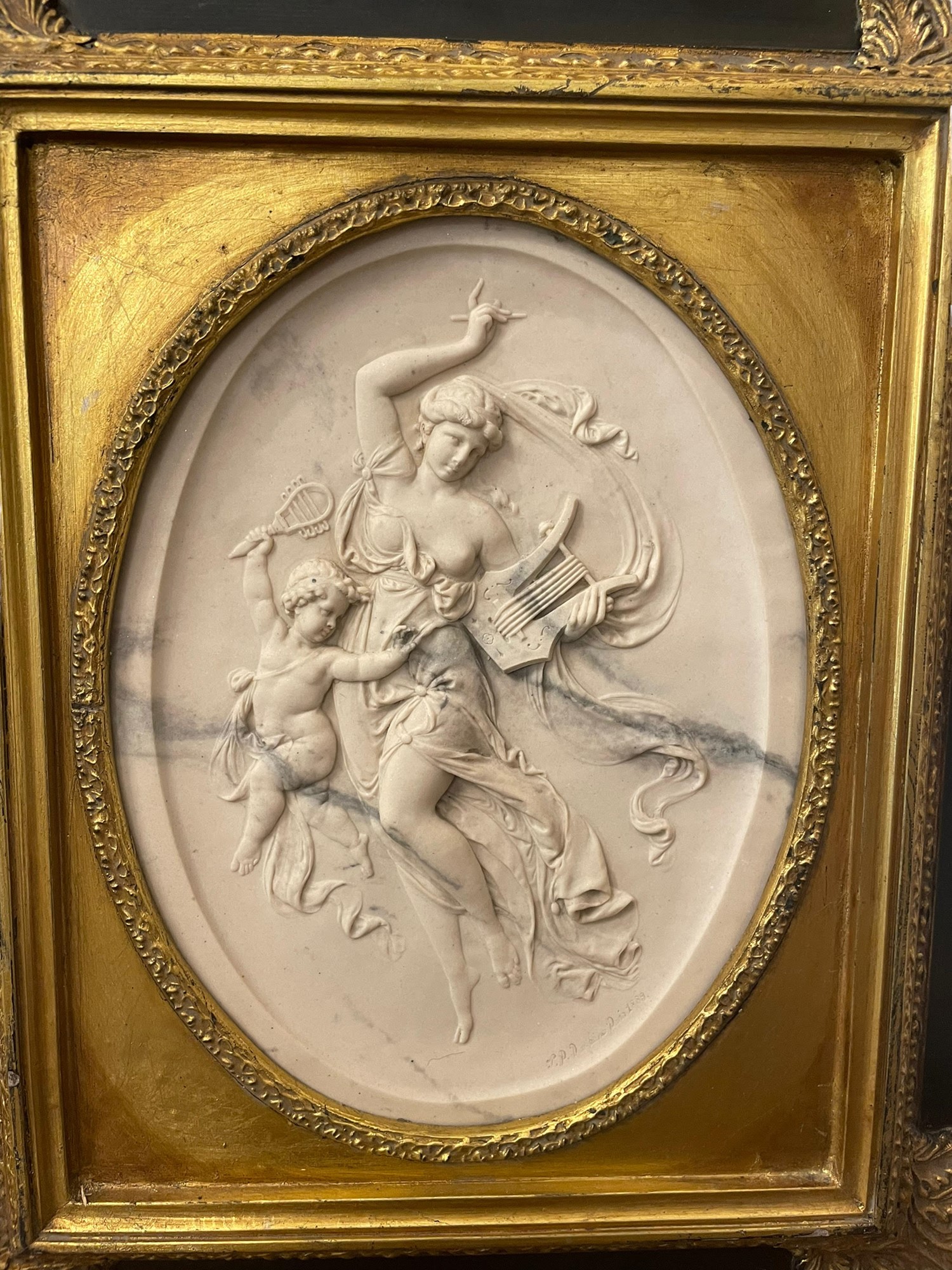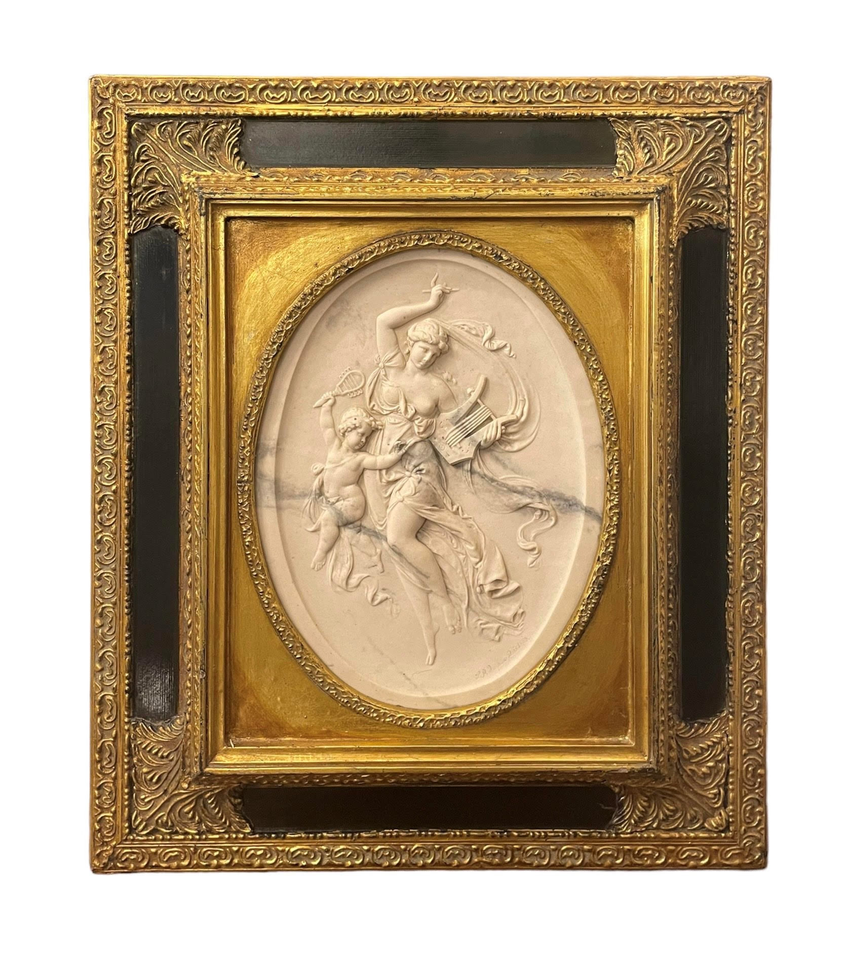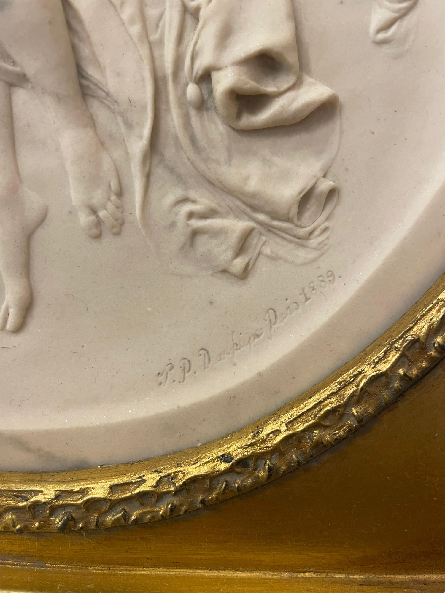 Placca in polvere di marmo di forma ovale. Firmato in basso a destra. In cornice dorata. Reca medaglia al retro.