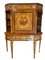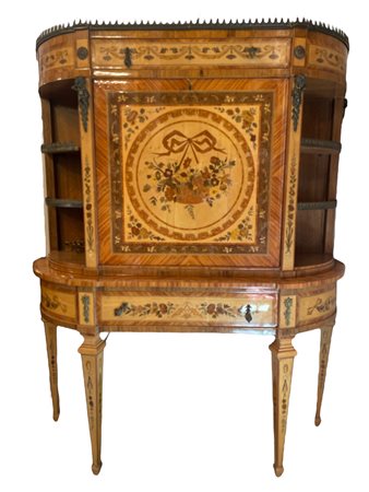in legno di rosa con intarsi in legno di frutto. Doppio cassetto e calatoia, a 4 gambe rastremate. Stile Luigi XVI
