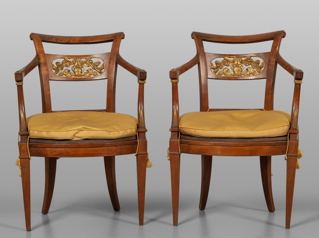 Coppia di poltrone Direttorio in ciliegio intagliato e dorato con medaglione nello schienale Genova sec.XIX