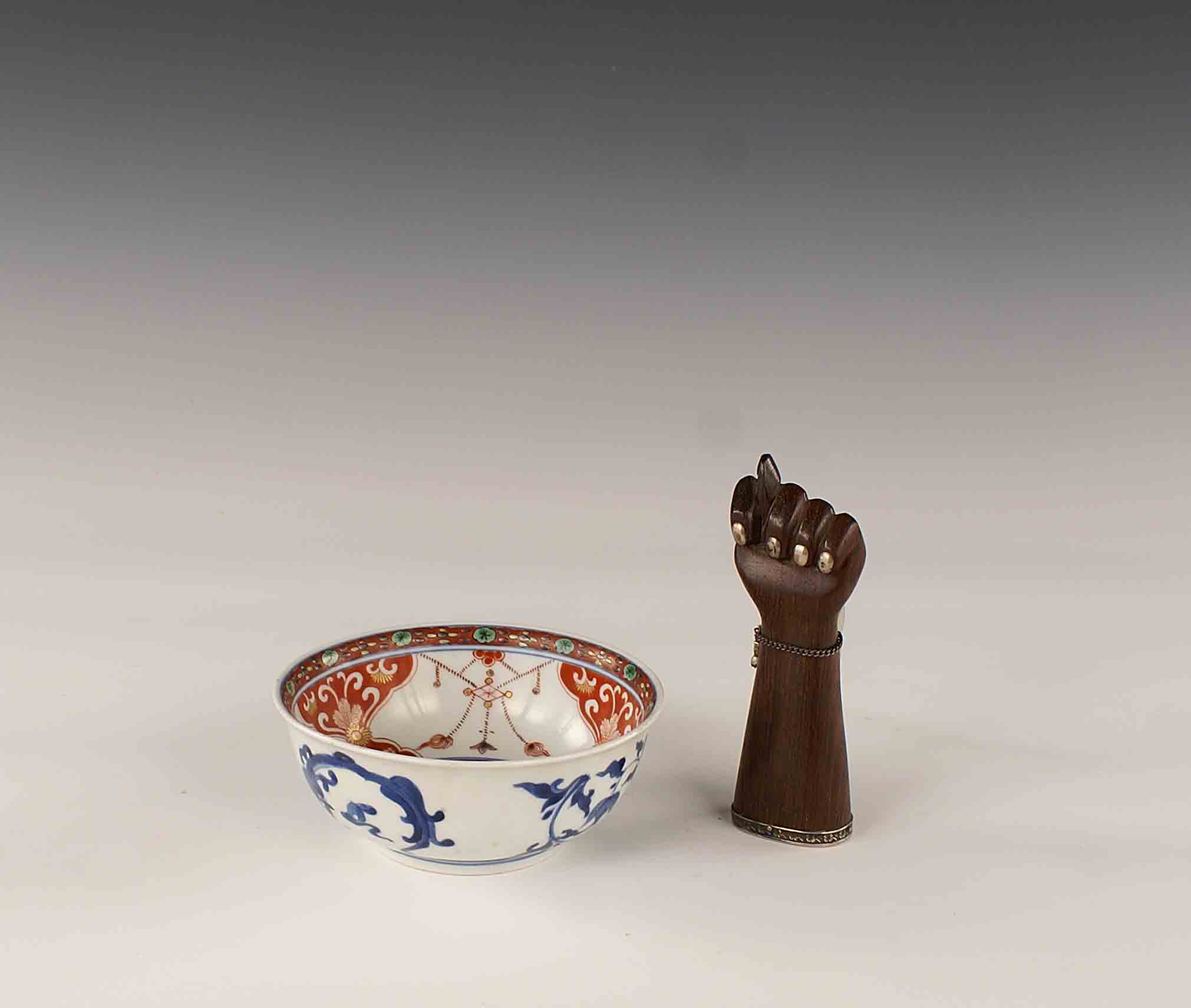 Lotto composto da una piccola bowl in porcellana policroma, Cina, vecchia manifattura ed un oggetto in legno e argento, manifattura indiana.