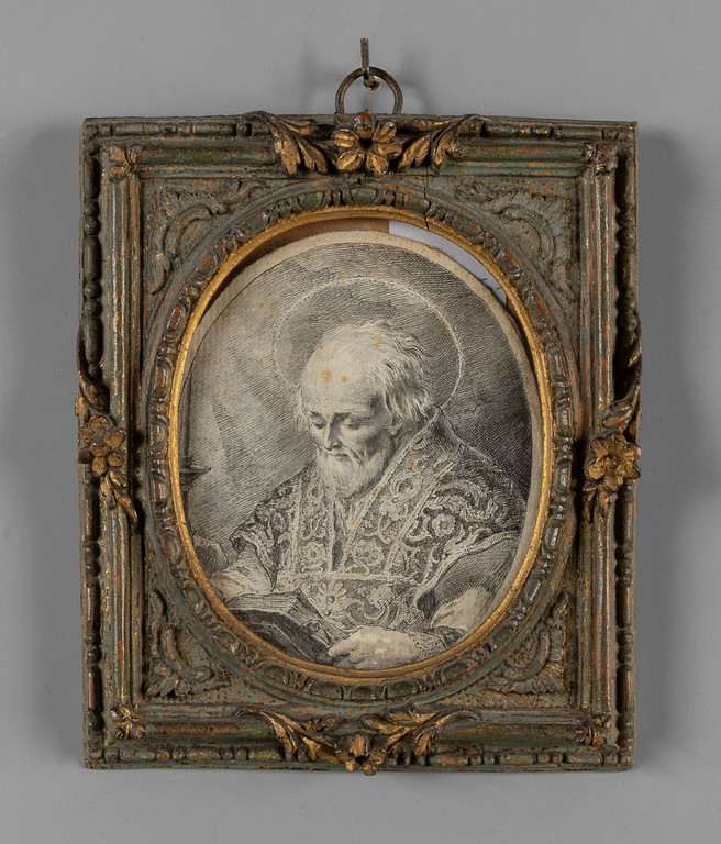 'Santo' disegno a penna cornice in legno scolpito e dorato coeva