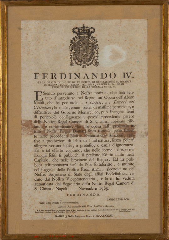 Editto per la proibizione del libro 'I diritti e i doveri del cittadino' emanato da Ferdinando IV a Napoli nel 1789