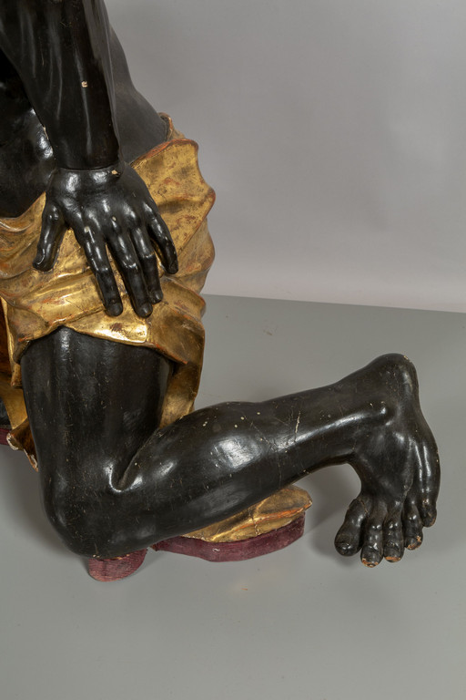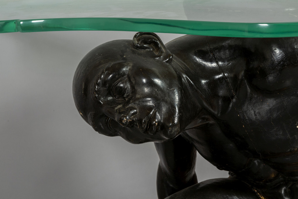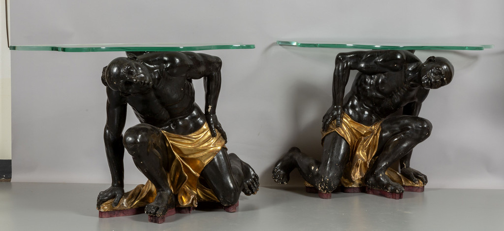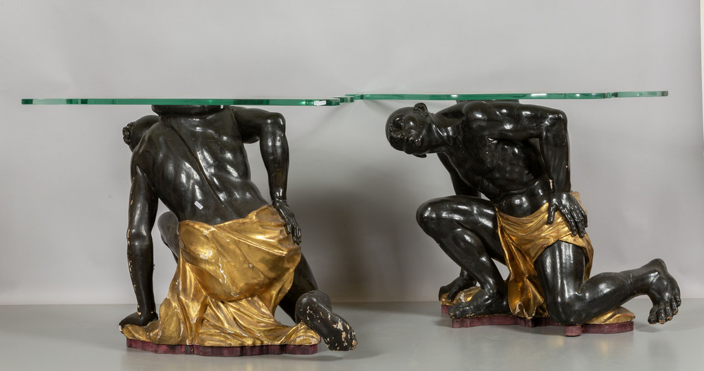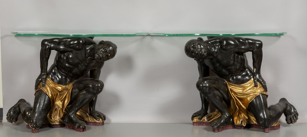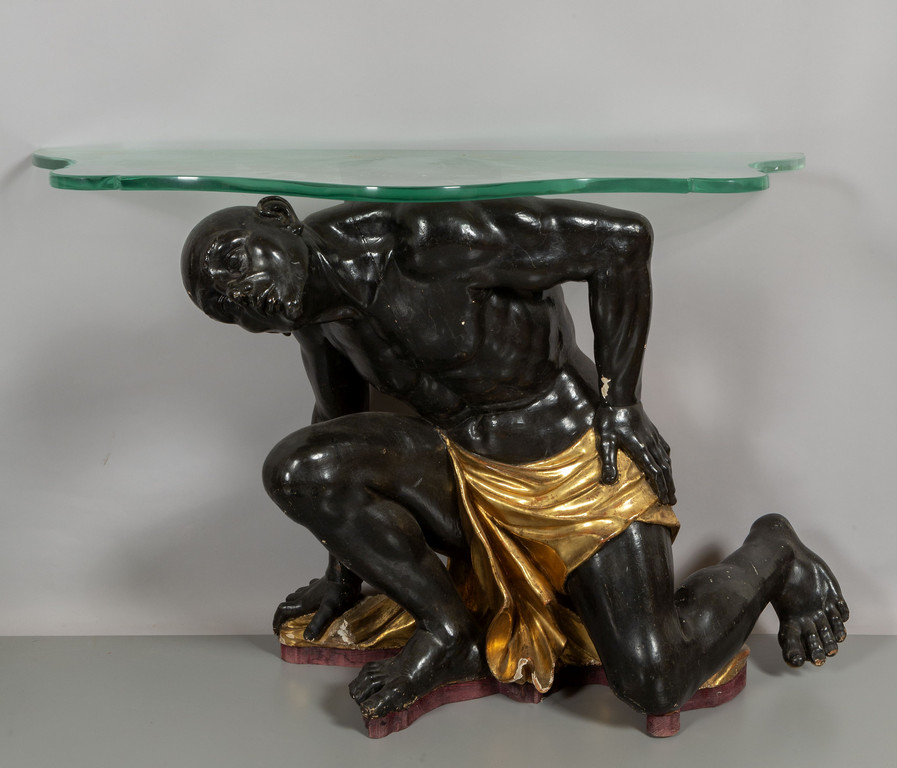 Coppia di consoles sorrette da una scultura raffigurante un moretto accovacciato in legno intagliato laccato e dorato piani in cristallo Venezia sec.XIX