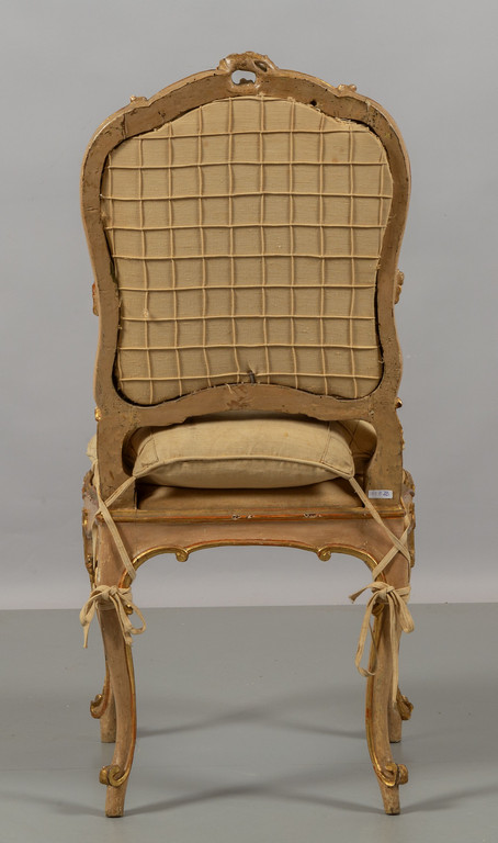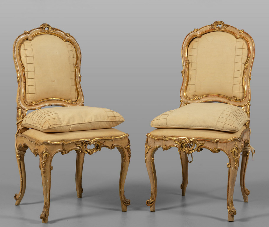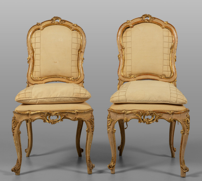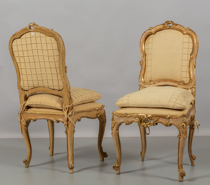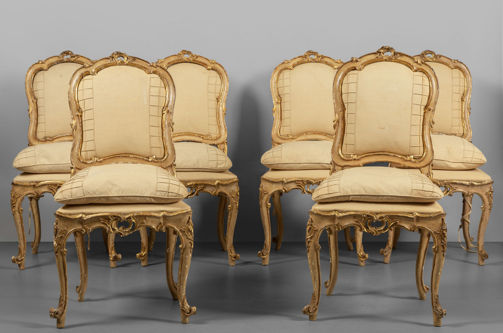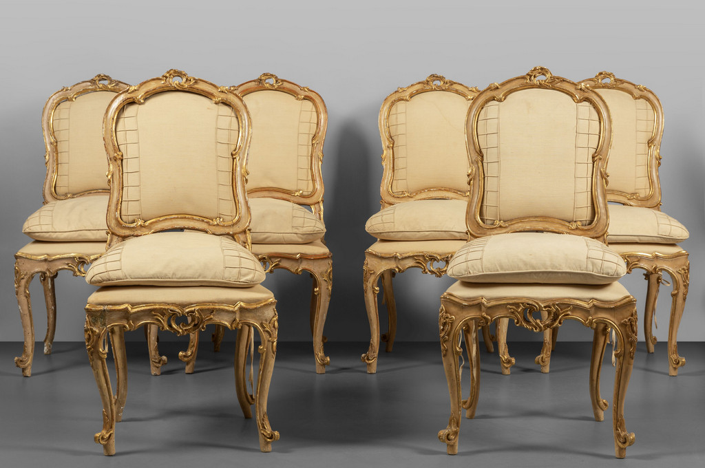 Raro gruppo di dodici sedie Luigi XV in legno intagliato laccato e dorato Lombardia sec.XVIII