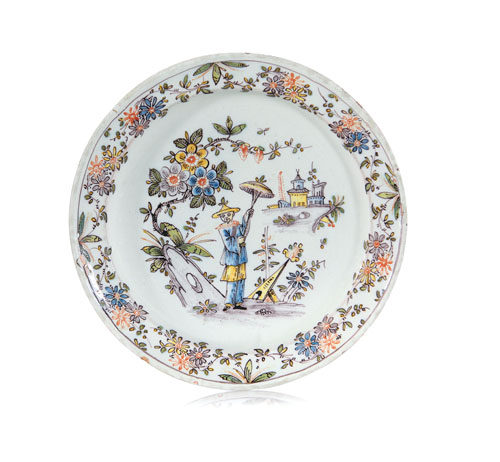 PIATTO IN MAIOLICA, MILANO, F. CLERICI, 1750 CA., decoro policromo a cineseria entro paesaggio, tesa con fiori; lievi cadute di smalto ai bordi.
