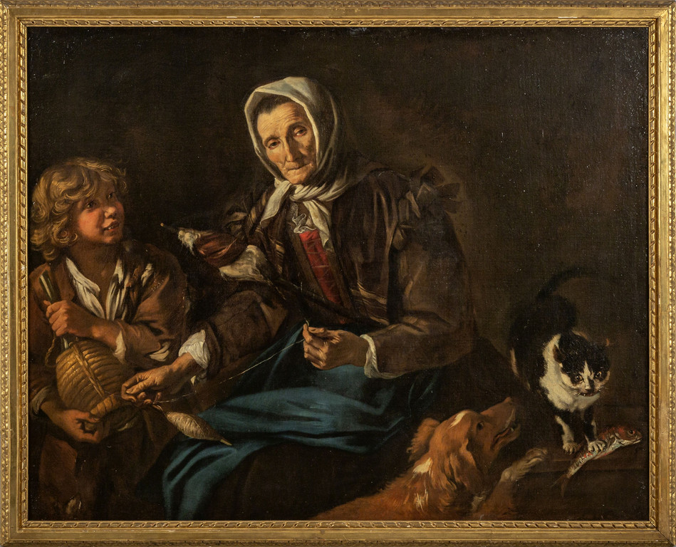 Scuola lombarda sec.XVIII 'Interno con filatrice e giovinetto' olio
