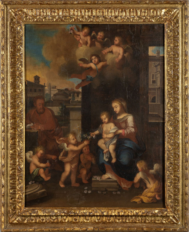 Scuola piemontese sec.XVIII 'Madonna con Bambino tra gli Angeli' olio cornice in legno intagliato e dorato