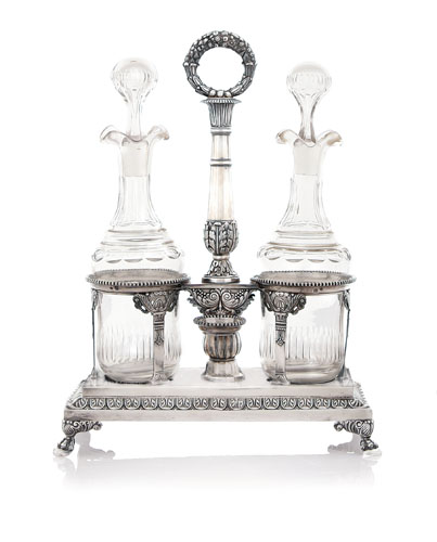 OLIERA IN ARGENTO, PARIGI, 1820, ARGENTIERE F.J.DOYEN, base rettangolare e sostegno centrale cimato da anello formato da festone, bordi a foglie e palmette, ampolle con tappo in cristallo non coeve.