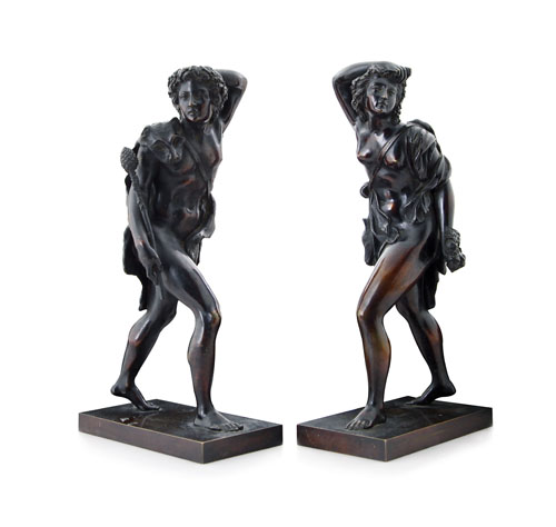 SCULTORE DEL XIX SECOLO Coppia di baccantiBronzo patinato, alt. cm 44,5.
