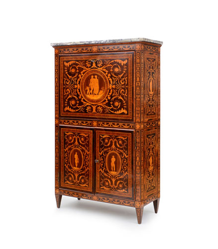 SECRETAIRE IMPIALLACCIATO AD INTARSI IN ESSENZE DI LEGNI RARI, BOTTEGA DI G.MAGGIOLINI, LOMBARDIA, ULTIMO QUARTO DEL XVIII SECOLO, fronte con calatoia e doppia anta, interamente decorato da girali di foglie d'acanto e festoni a contorno di riserve ovali contenenti figure allegoriche, piedi ad obelisco rovesciato, piano in marmo d'epoca successiva; restauri.