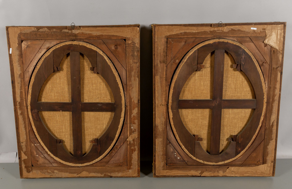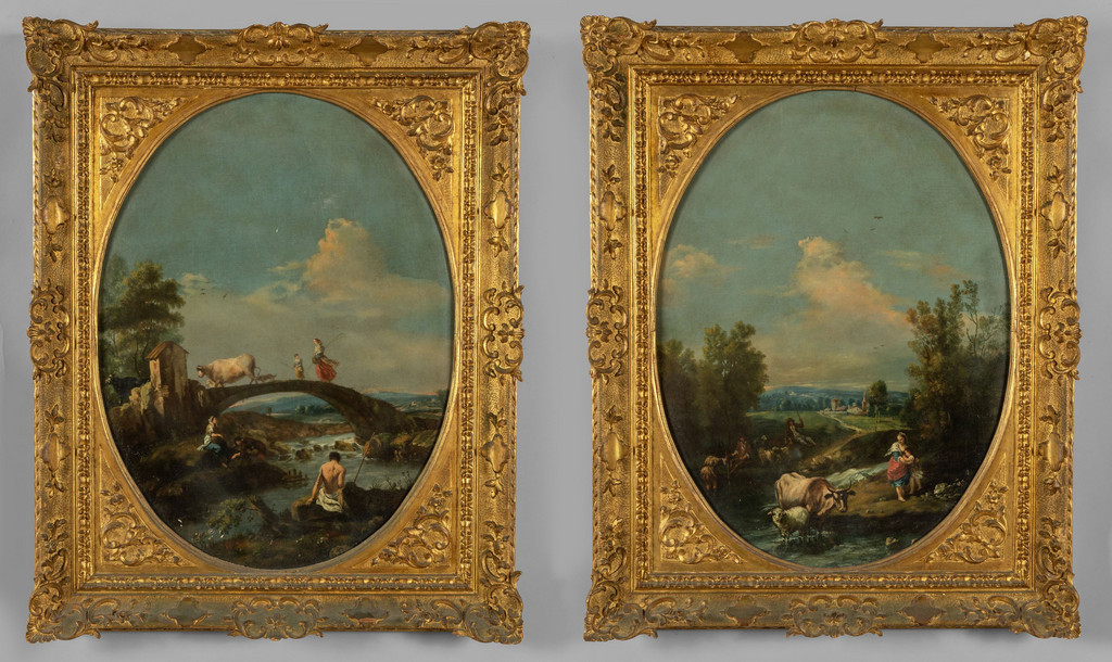 Scuola veneta sec.XVIII 'Paesaggi animati' coppia di olii di forma ovale