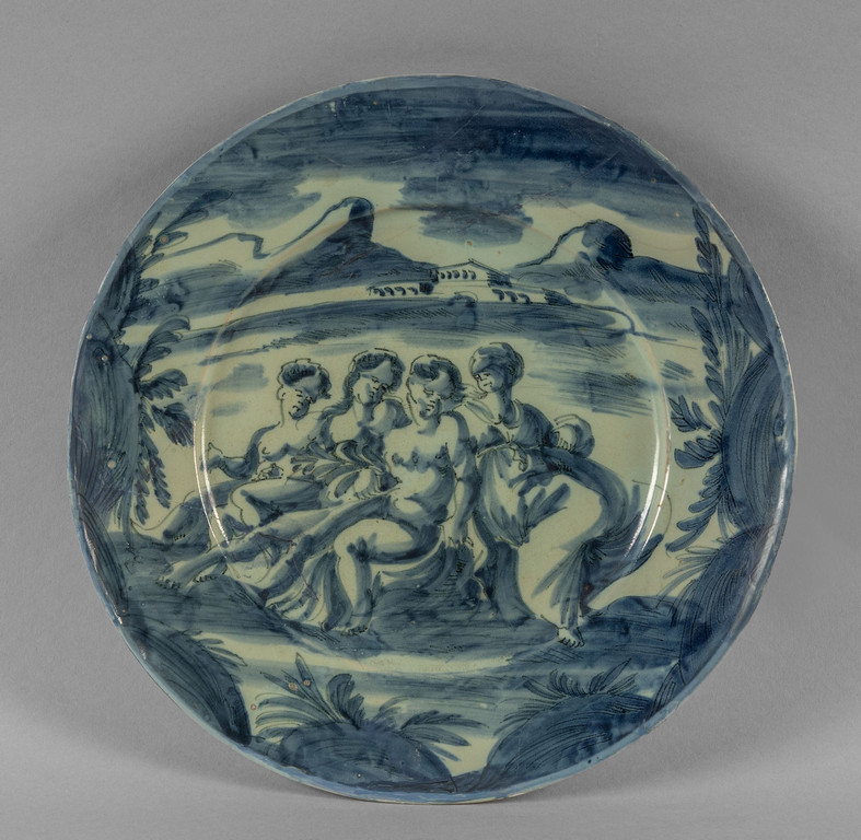 Piatto in ceramica decorazione bianca e blu con figure centrali in un paesaggio Savona sec.XVII