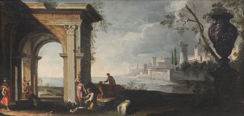 SCUOLA ROMANA DEL XVII SECOLO Marina con ruderi e astanti Olio su tela, cm...