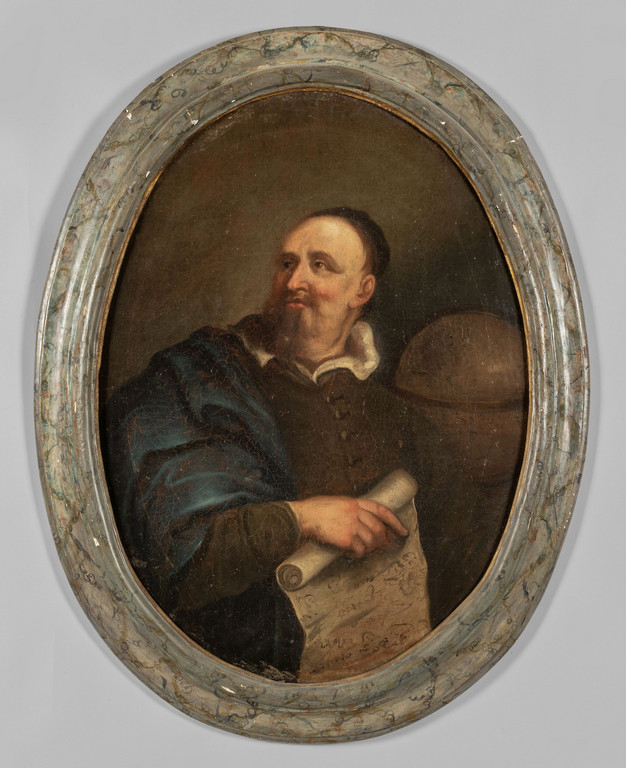 'L'astronomo' olio di forma ovale sec. XVIII cornice coeva in legno laccato a finto marmo