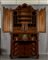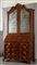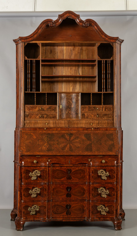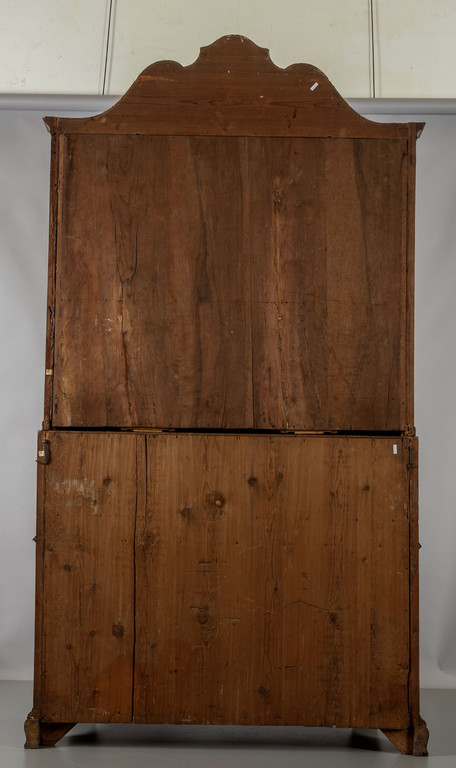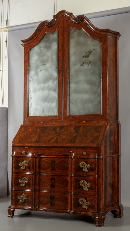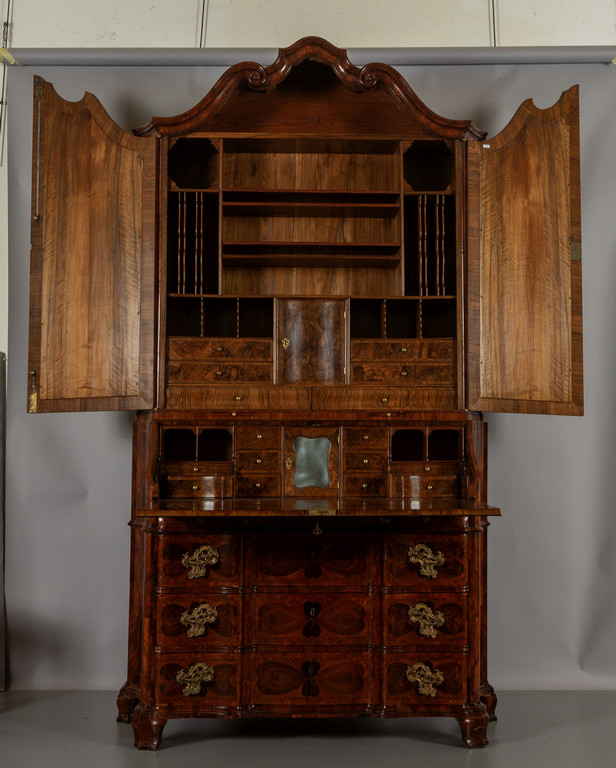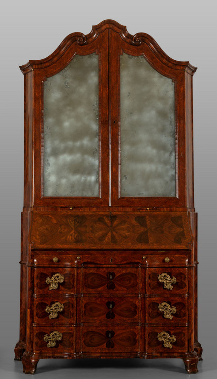 Importante mobile a doppio corpo Luigi XIV movimentato sul fronte e sui fianchi lastronato in viola ed intarsiato con il tradizionale motivo del cuore in palissandro ripetuto sul fronte sui fianchi e sulla ribalta alzata con due sportelli con specchi all'interno serie di cassettini lastronati in radica di tuja Genova I metà sec.XVIII