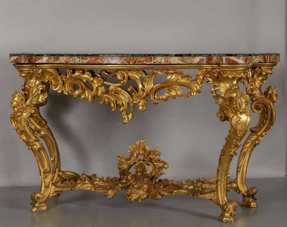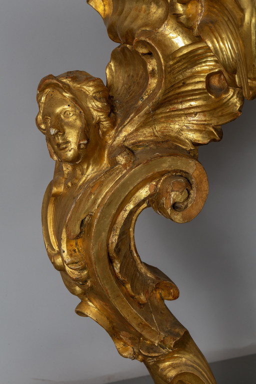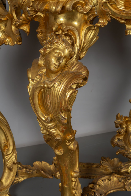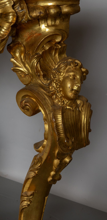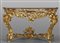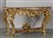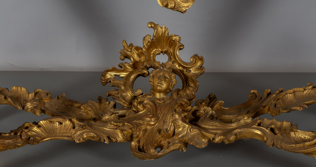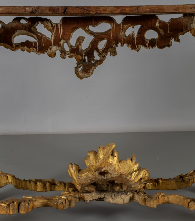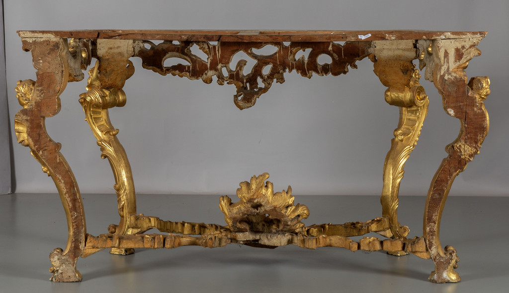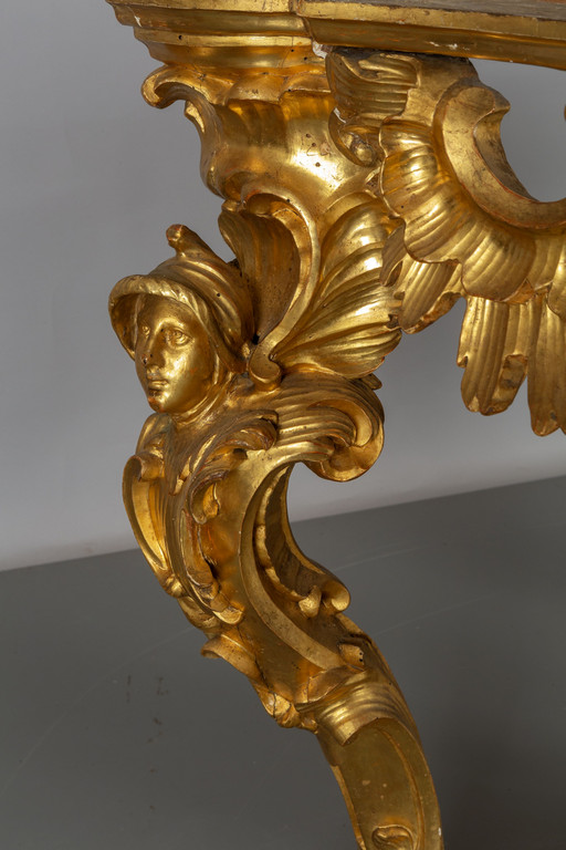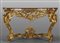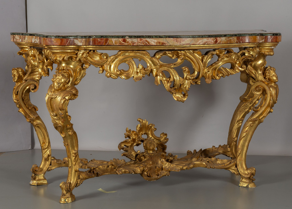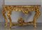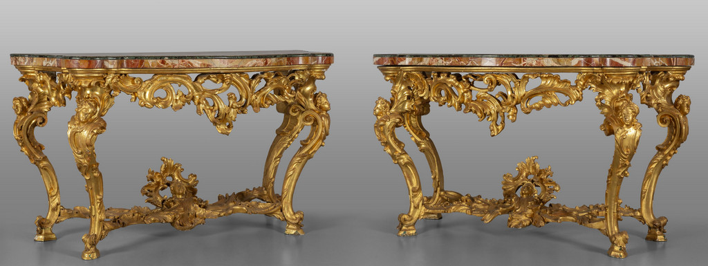 Coppia di consoles Luigi XV in legno finemente intagliato e dorato piani coevi lastronati in marmi vari Roma metà sec.XVIII