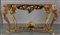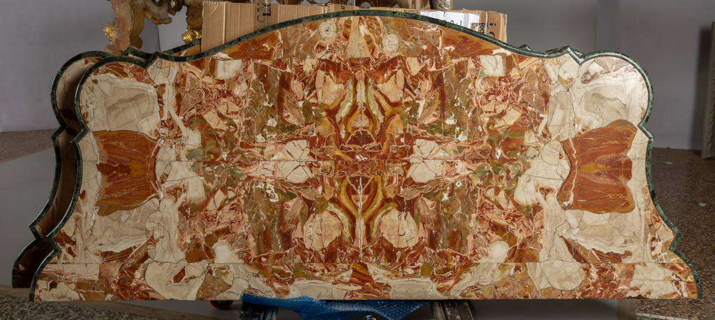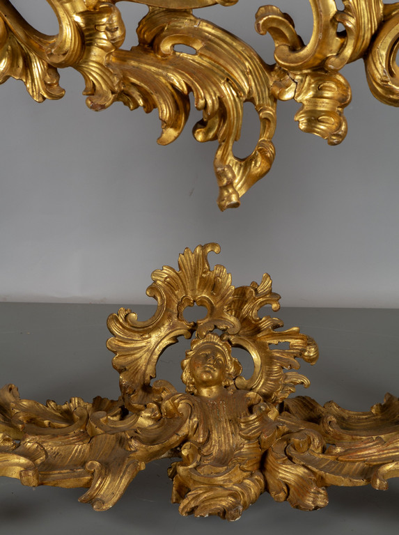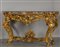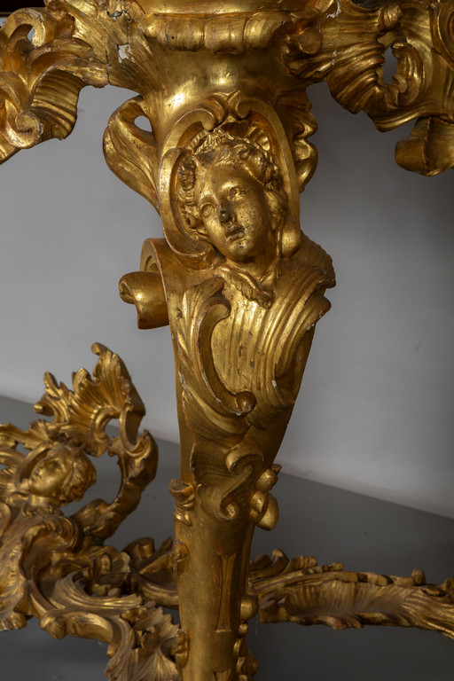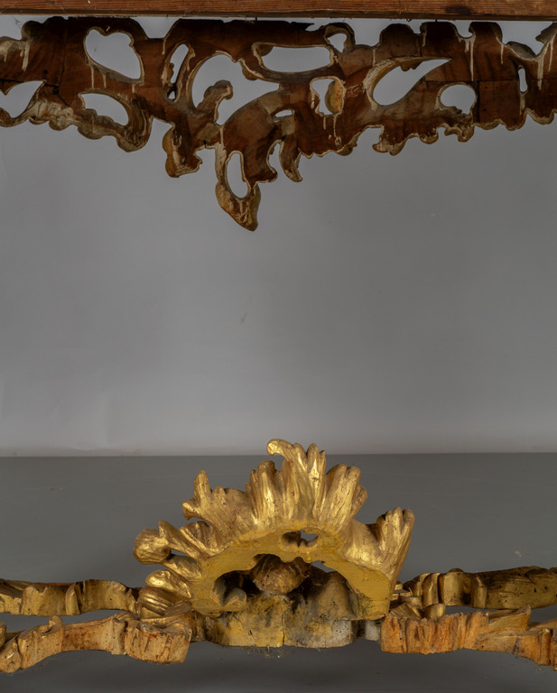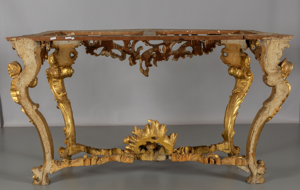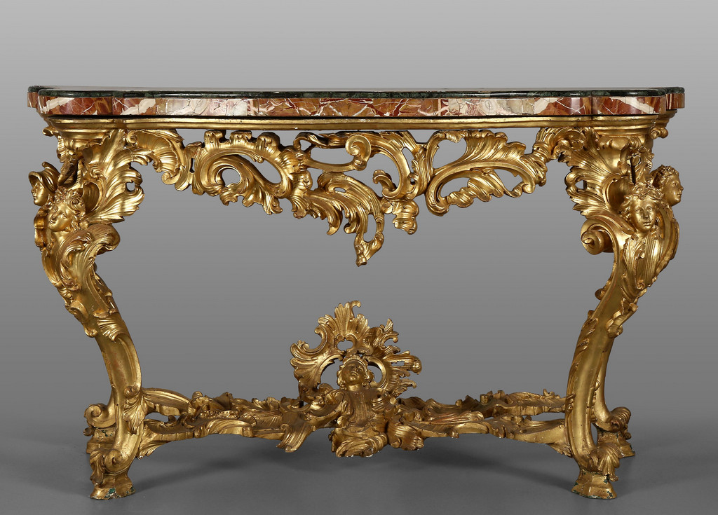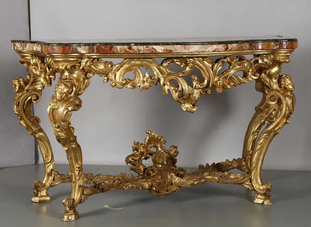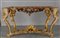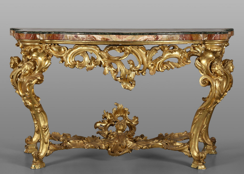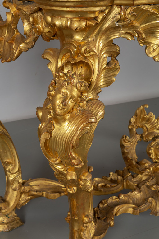 Coppia di consoles Luigi XV in legno finemente intagliato e dorato piani coevi lastronati in marmi vari Roma metà sec.XVIII