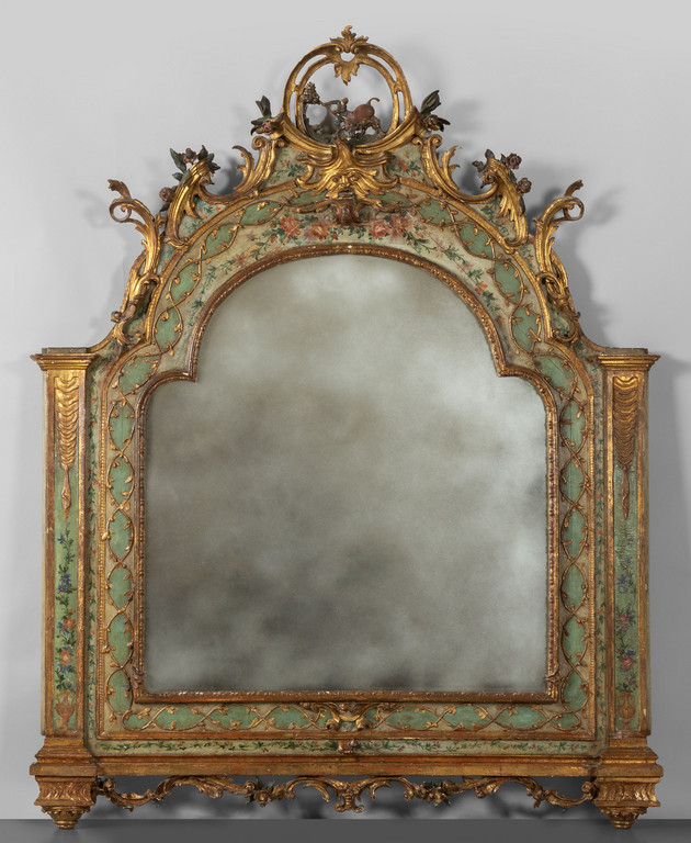 Caminiera Luigi XV in legno intagliato laccato e dorato cimasa scolpita a pelle di rapa centrata da scena di caccia al toro Lombardia I metà sec.XVIII