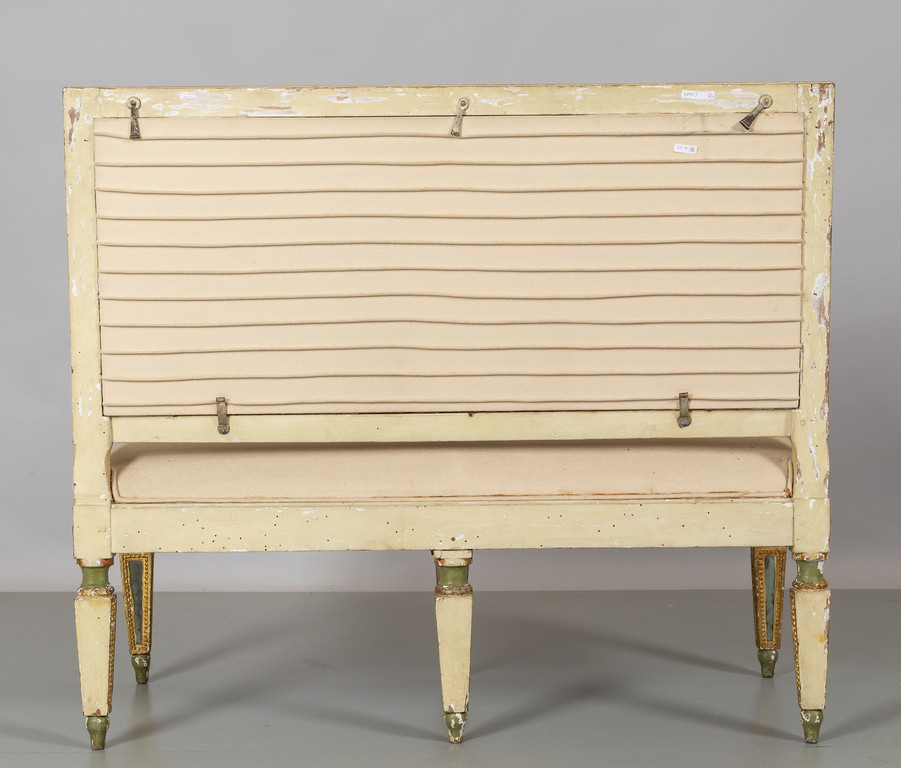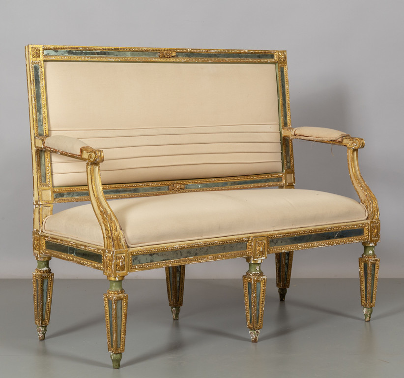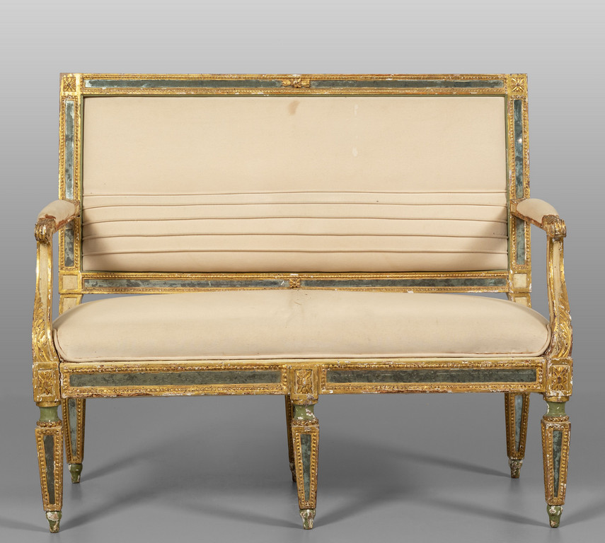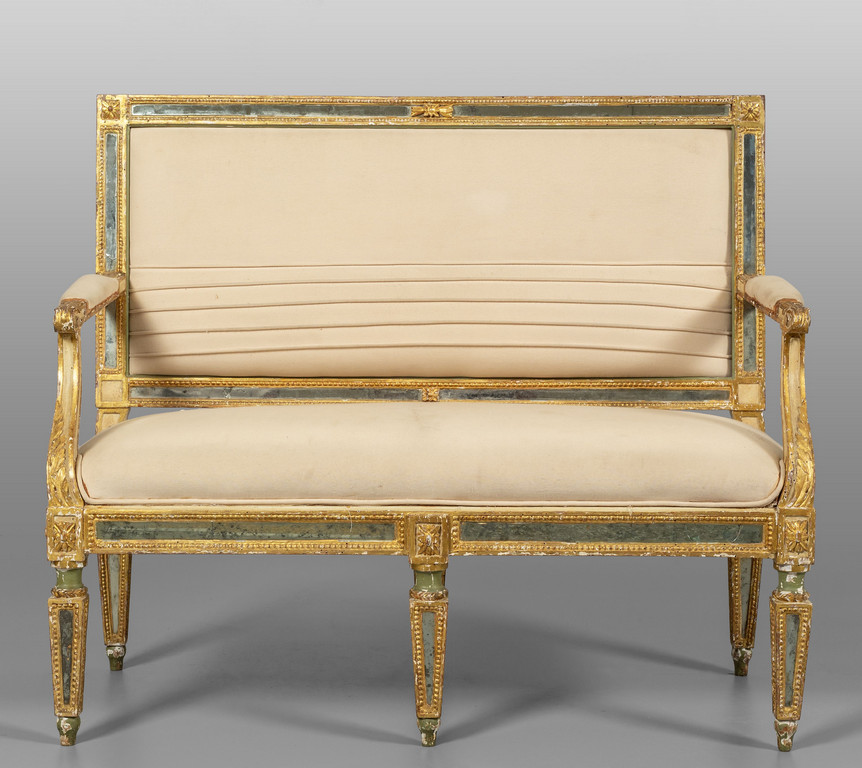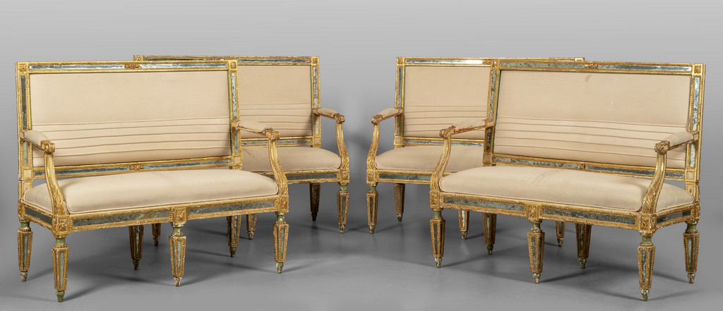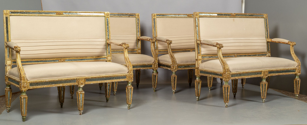 Quattro divani Luigi XVI in legno laccato e dorato con intarsi in specchio sec.XVIII