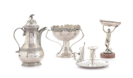 BUGIA GIORGIO III IN ARGENTO, LONDRA, 1763; COPPA A TRE MANICI IN ARGENTO, BIRMINGHAM, 1908; UNA COPPA CON SOSTEGNO A FIGURA IN ARGENTO E UNA CAFFETTIERA IN ARGENTO IN STILE IMPERO, XX SECOLO.