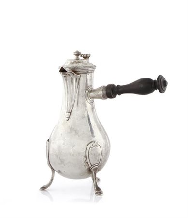CAFFETTIERA CON MANICO TRAVERSO IN ARGENTO, PARIGI, FINE XVIII SECOLO, ARGENTIERE P.JOUBERT, piriforme liscia su tre piedini, monogramma inciso entro scudo coronato.