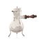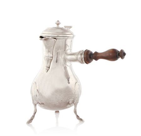 CIOCCOLATIERA IN ARGENTO, FRANCIA, 1762, piriforme liscia su tre alti piedi a voluta, coperchio con cimatura mobile (bloccata), manico traverso in legno; reca punzone con data incisa.