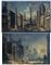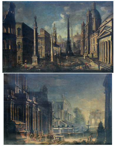 I due grandi dipinti, di notevole impatto scenografico, rappresentano due "capricci" con rovine ed edifici architettonici antichi inseriti in un contesto paesaggistico di gusto italiano classico. Nella prima tela si vede un affascinante "summa" di edifici romani ben riconoscibili: sulla sinistra in primo piano il Colosseo, sulla destra il Pantheon seguito, in prospettiva, dalla chiesa di Sant'Agnese in Agone a Piazza Navona. Si distinguono poi perfettamente la fontana del Tritone e quella berniniana dei Fiumi a Piazza Navona, la colonna Traiana, gli obelischi Vaticani, l'arco di Costantino, i due Dioscuri del Quirinale, le rovine delle terme di Caracalla, Castel Sant'Angelo e, a chiusura della composizione, la Basilica di san Pietro. Piccoli personaggi, dipinti da un altro pittore, animano discretamente la scena dove le architetture costituiscono comunque elementi assoluti. Nella seconda tela, più chiara e diversa come stile, si vedono ancora edifici d'architettura splendida e immaginifica ma non legati a realtà particolari se non sul piano ispirativo. Sulla sinistra domina in primo piano un edificio di ricchissima architettura classica con colonne ioniche e corinzie, fastigi, vasi ornamentali, bassorilievi, urne, plinti monumentali e quanto altro possa servire a formare un fantasioso palazzo "all'antica". Segue un secondo edificio, anch'esso ricco di riferimenti classici, con colonnati, scale e un giardino a gradoni con fontane e fontanelle ispirato in parte all'antico casino al Pigneto del Marchese Sacchetti e in parte ai giardini di Villa d'Este. Una gran vasca con al centro una fontana conclude la vertiginosa struttura. In lontananza, a modo di sfondo, un arco di trionfo a tre fornici di suntuosa composizione. In primo piano una architettura corinzia con un gruppo statuario di putti issati su di un alto plinto decorativo. Le figure in questa scena sono numerose e giocano un ruolo ben diverso rispetto al precedente quadro. Si assiste infatti in primo piano sulla sinistra una scena di sacrificio all'antica con sacerdotesse ed accoliti che trasportano la legna, devote e devoti con piccoli fanciulli. Due soldati, vestiti alla romana, osservano quanto sta accadendo. Le due tele sono opere romane collocabili cronologicamente fra la fine del Seicento e il primo quarto del Settecento
