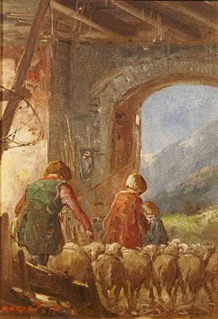 Mario Fattori (1930), "Vita toscana", olio su tela, cm. 35x25, firmato in...