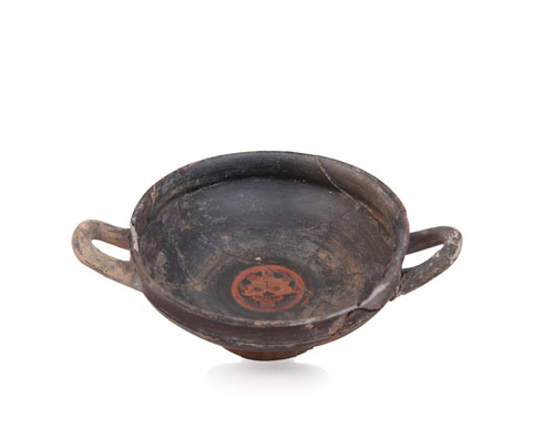 KILIX ATTICA IN ARGILLA FIGULINA, V SECOLO A.C., biansata con labbro svasato, vasca centrata da gorgona rossa su fondo verniciato nero; rincollature e mancanze.