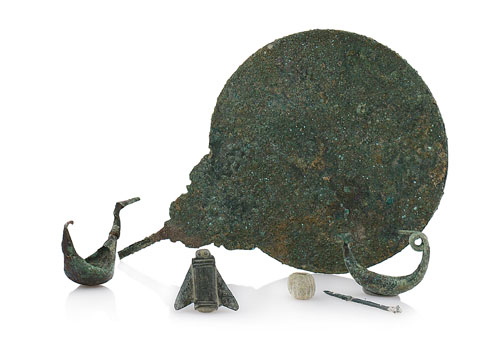 SPECCHIO IN BRONZO, GRECIA, VI-II SECOLO A.C., disco circolare con impugnatura frammentaria; corrosione e usure, unito a DUE FIBULE IN BRONZO, ETRURIA, VIII-VI SECOLO A.C., una a navicella incisa con ardiglione e staffa separati, priva di molla e una ad arco con molla laterale priva di elementi; unite a UNA FIBULA ROMANA, IV-V SECOLO A.C., a foggia di cicala; mancanze.