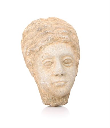 TESTA FEMMINILE IN MARMO SCOLPITO, EPOCA ROMANA, III-IV SECOLO D.C., ovato del volto delineato con capelli ondulati e scriminatura centrale.