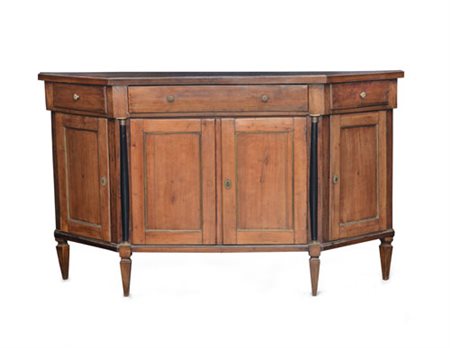 CREDENZA IMPERO IN NOCE, VENETO, XIX SECOLO, fronte scantonato a quattro ante e tre cassetti con montanti a colonne ebanizzate; restauri, sostituzioni e sbeccature.