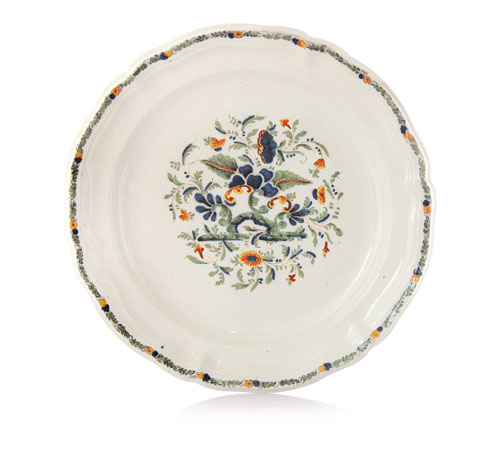 GRANDE PIATTO IN MAIOLICA, NOVE DI BASSANO, ANTONIBON, XVIII SECOLO, bordo sagomato, decoro policromo "al ponticello"; sbeccatura al retro; vecchia etichetta "M.Tronconi Antichità Milano" al retro.
