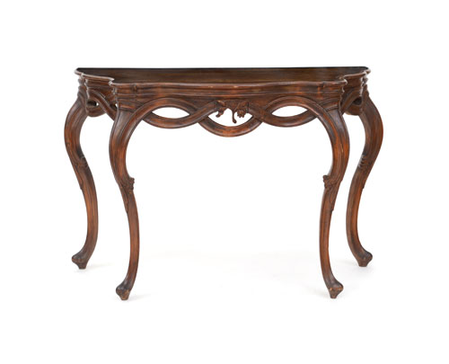 CONSOLE IN NOCE INTAGLIATO, VENEZIA, XVIII SECOLO, piano sagomato su gambe arcuate, grembiale intagliato con motivo a otto e centrato da ricciolo rocaille; restauri e usure.