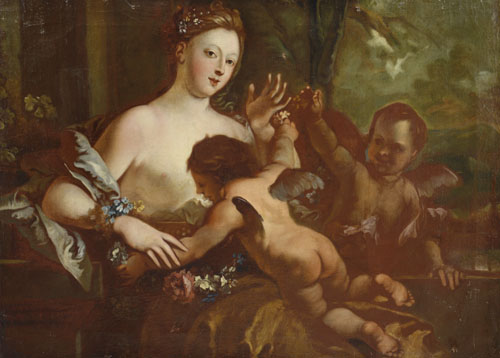 PITTORE DEL XVIII SECOLO Scena allegoricaOlio su tela, cm 70x97; opera priva...